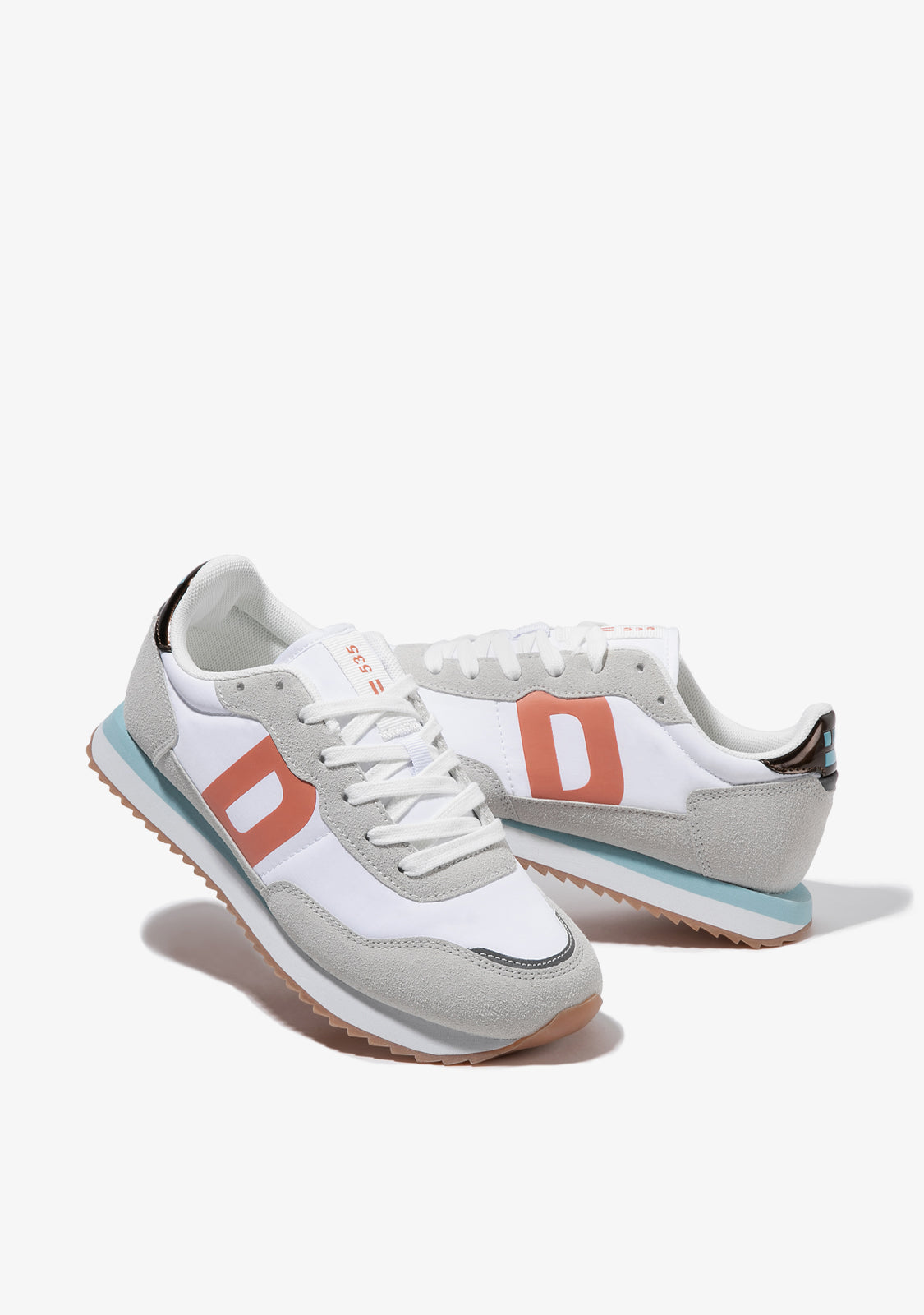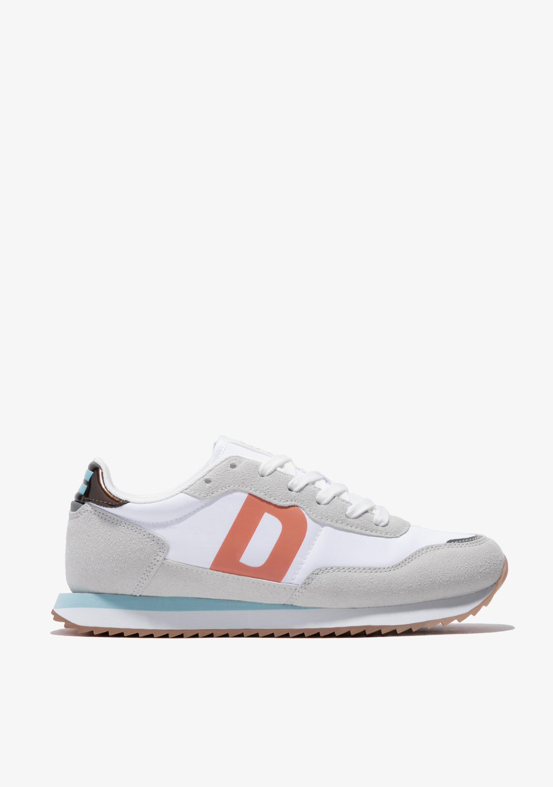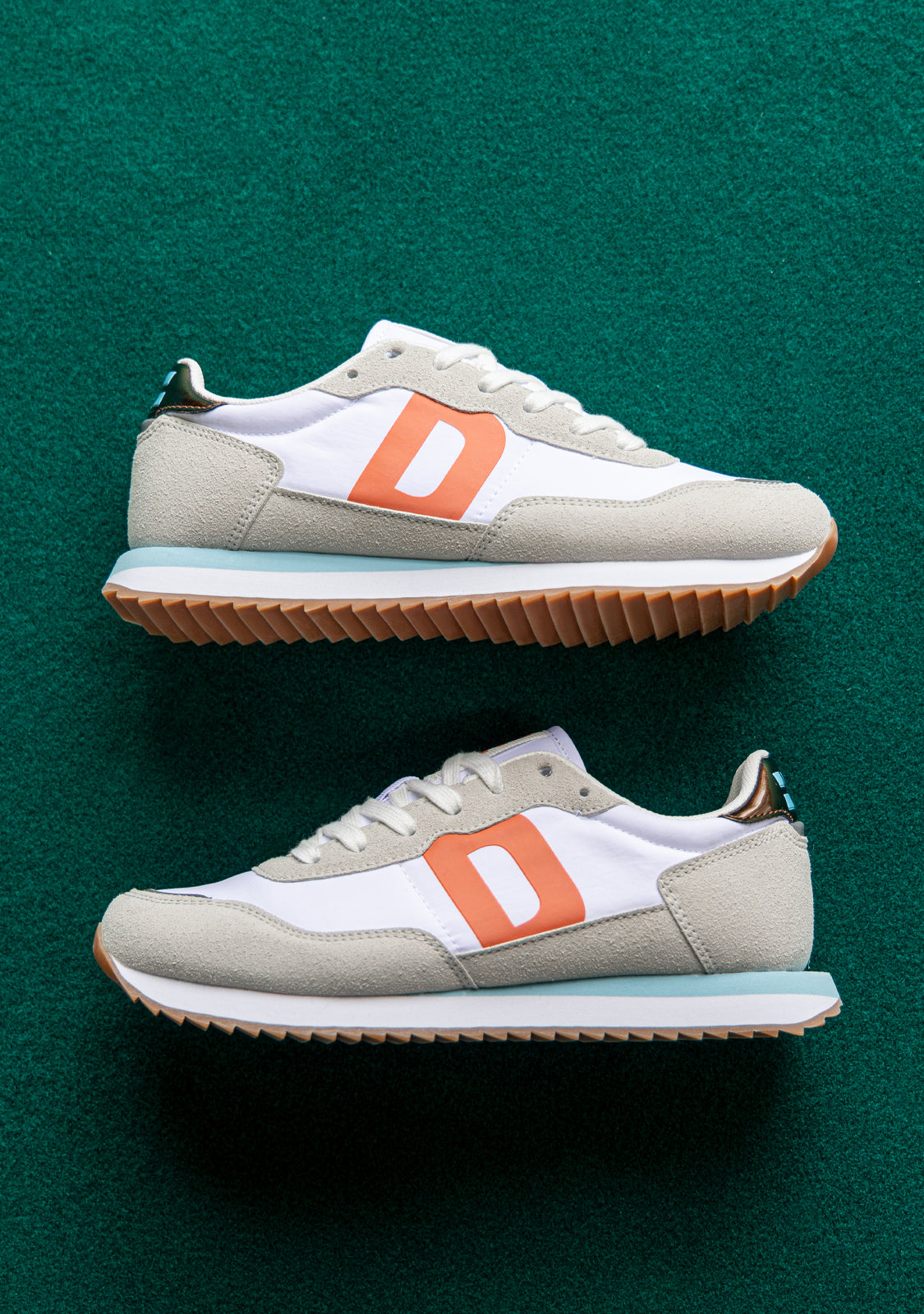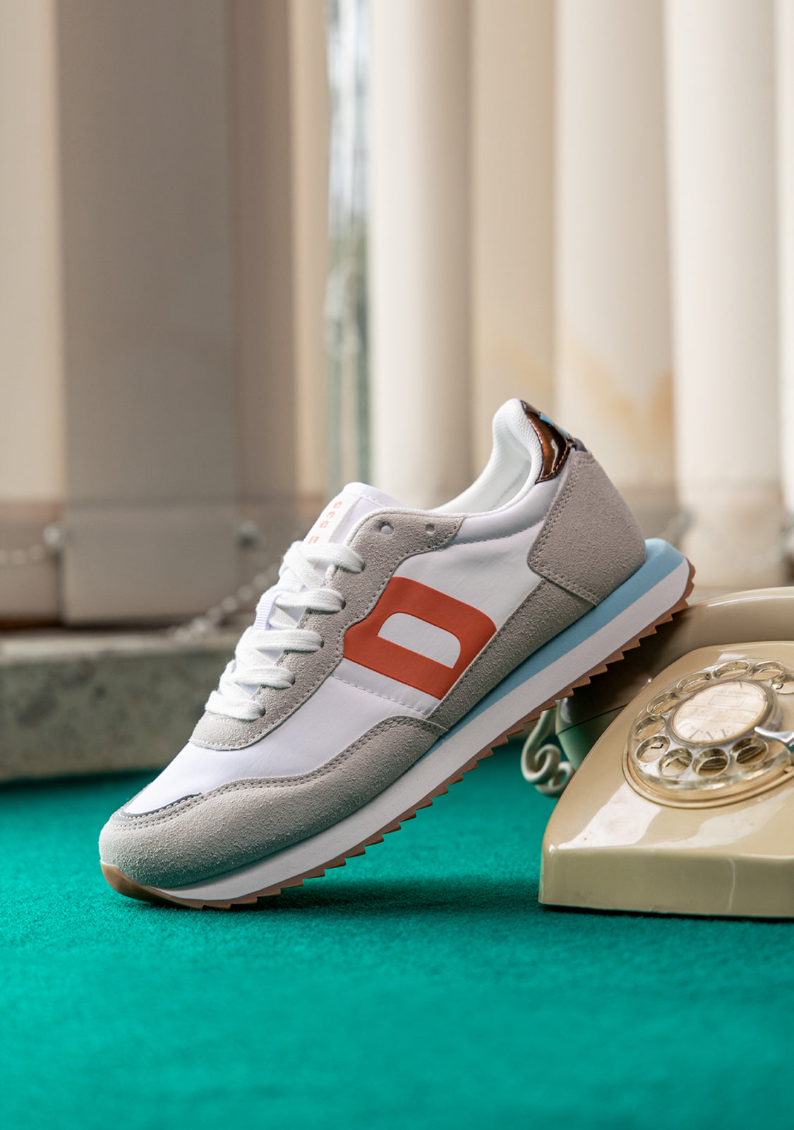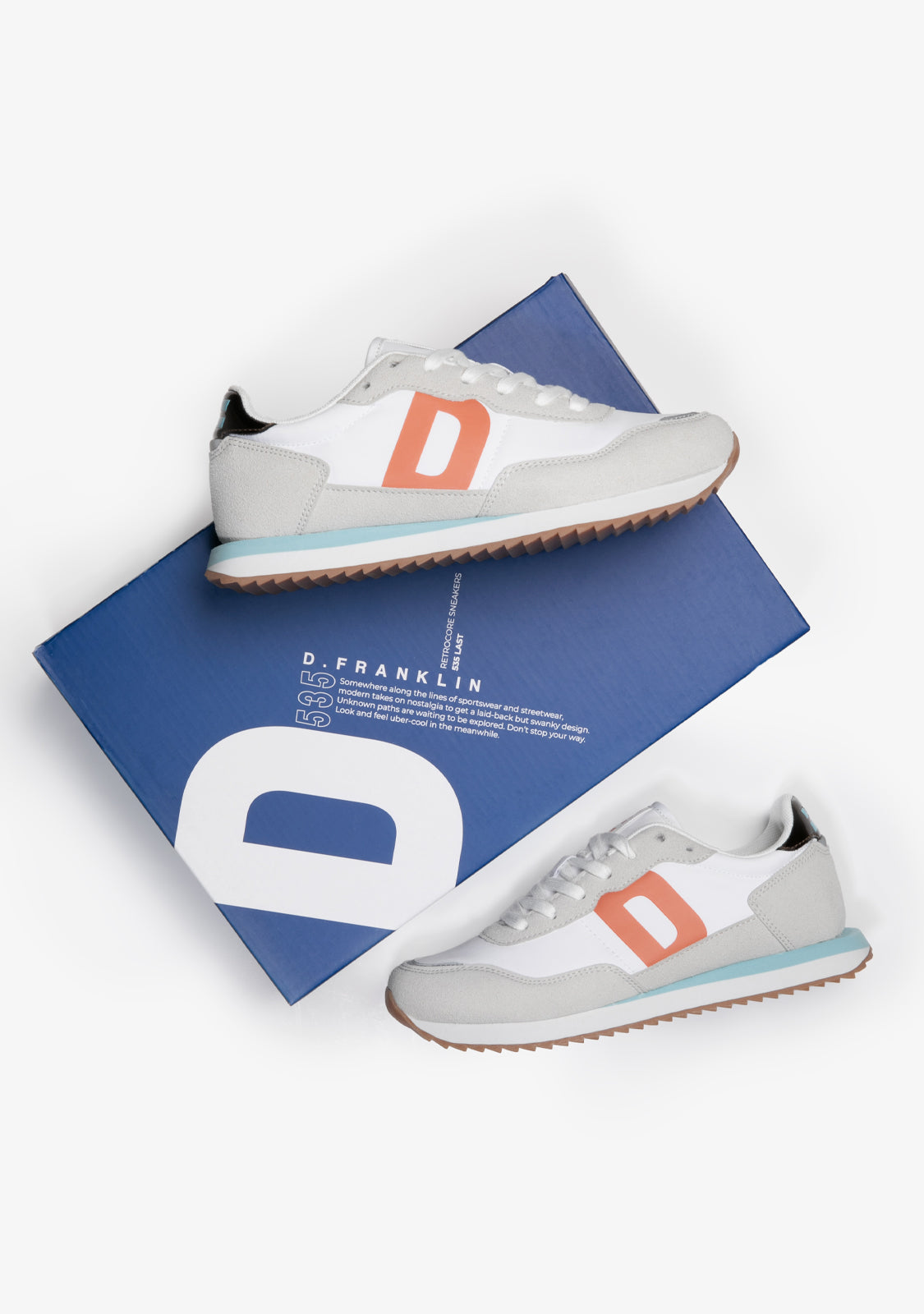 Ajenas al paso del tiempo. Creadas a través de materiales sintéticos. Suela en combinación de materiales: patín en TR para máxima tracción y cuña en EVA de doble densidad para una pisada firme y cómoda. Collarín acolchado y cierre con cordones de algodón. Logo en relieve D.Franklin en talón sobre azul marino y emblema naranja en el lateral. Hechas para la ciudad.