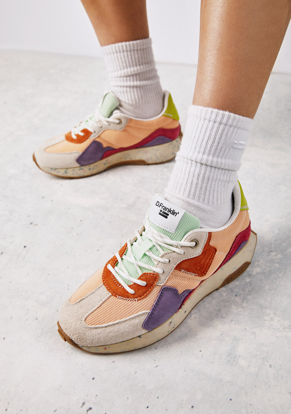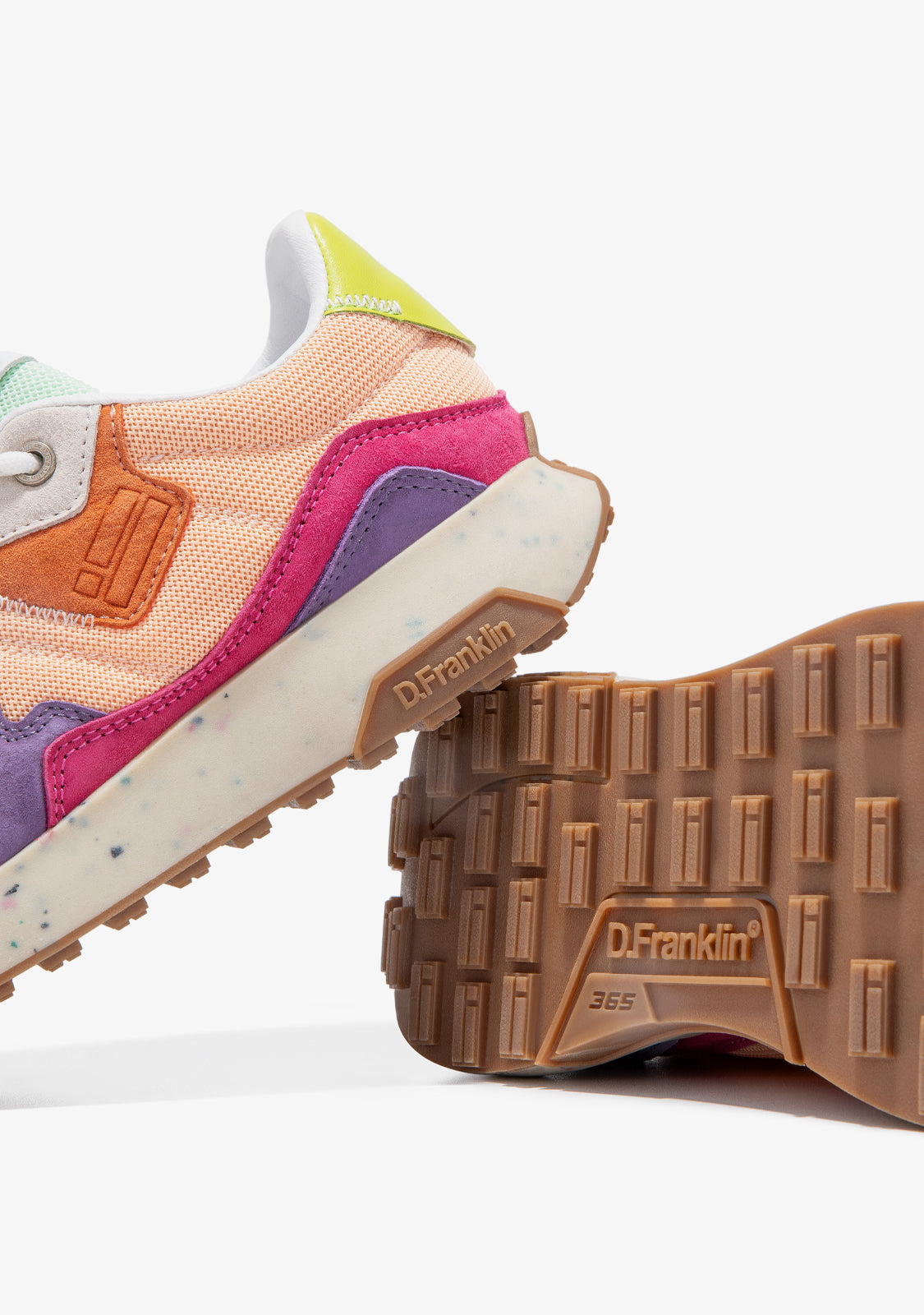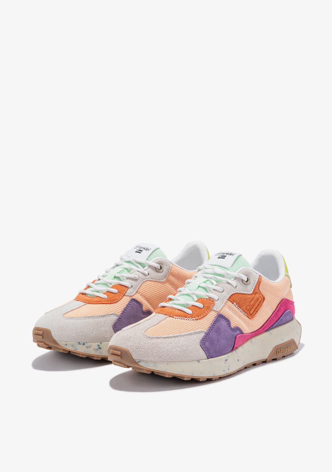 Este modelo combina los tonos naranjas, verdes y morados en un diseño que destaca por su singularidad. Cuenta con bandera D.Franklin en su lateral y cordones con detalles para una perfecta sujeción. Además, presenta una suela de dos densidades. Una primera de materiales reciclados creada para una pisada cómoda y ligera; y una segunda con relieve que le proporciona agarre.