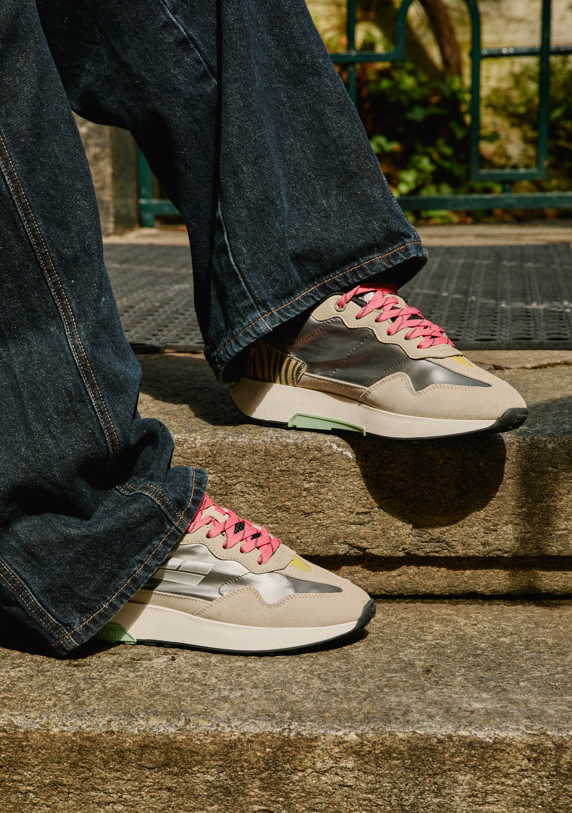 Este modelo fusiona distintas texturas con tonos plateados y rosas que destacan su singularidad. Cuenta con la bandera D.Franklin en su lateral y cordones estampados para una perfecta sujeción. Además, presenta una suela de dos densidades. Una primera de materiales reciclados creada para una pisada cómoda y ligera; y una segunda con relieve que le proporciona agarre.