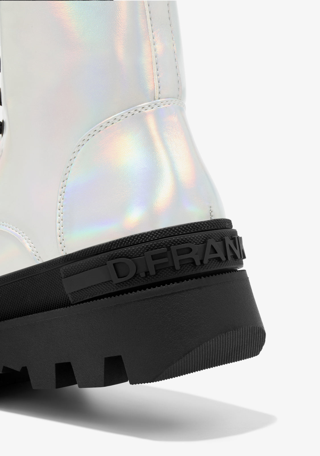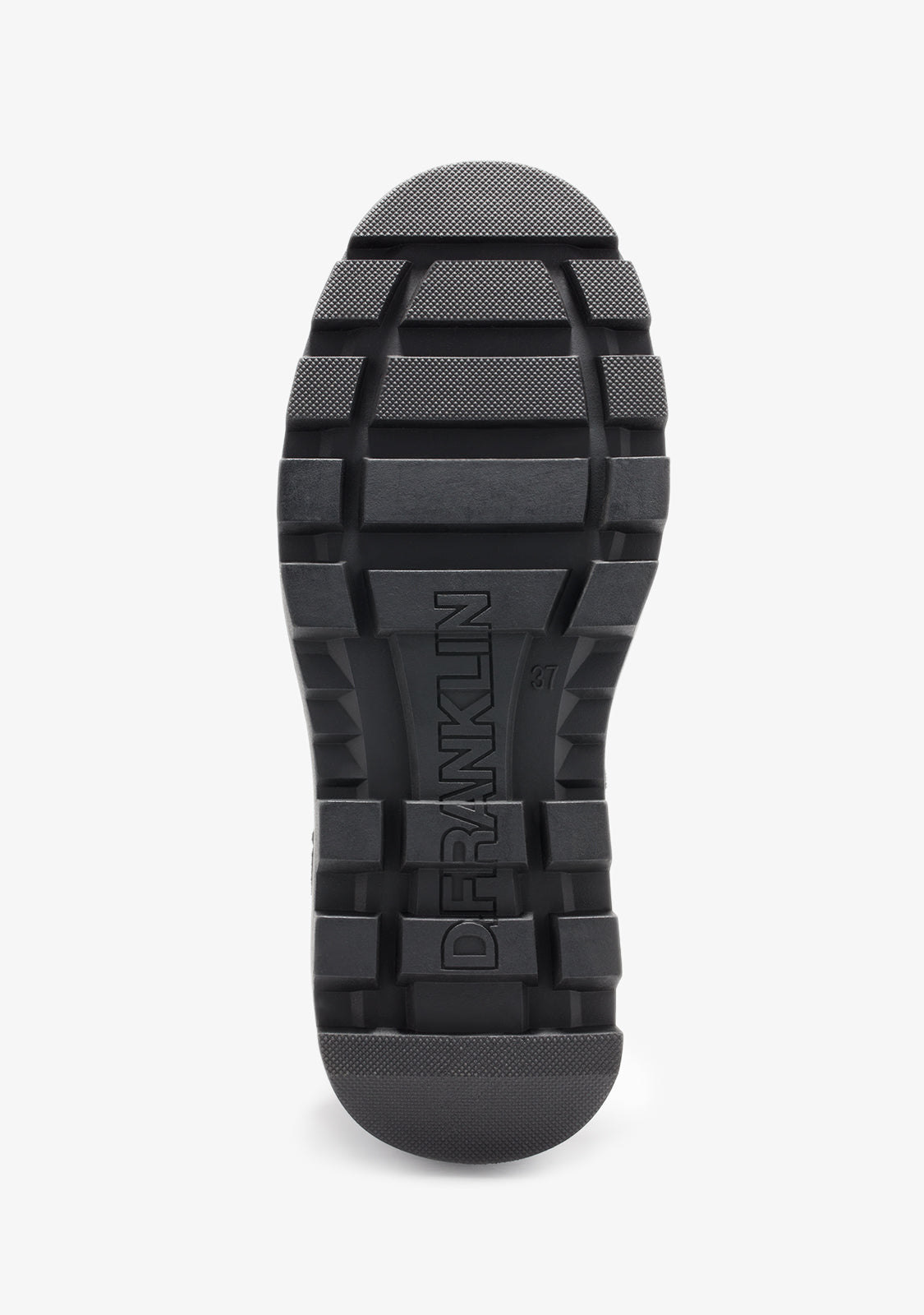 Este modelo D.Franklin en tono blanco y acabado con textura presenta una cremallera interior en uno de sus laterales y cordones de algodón ajustables. Su suela estilo track permite un agarre inigualable. Además, cuenta con personalización en relieve de nuestro logo y emblema en su cuña y puntera.