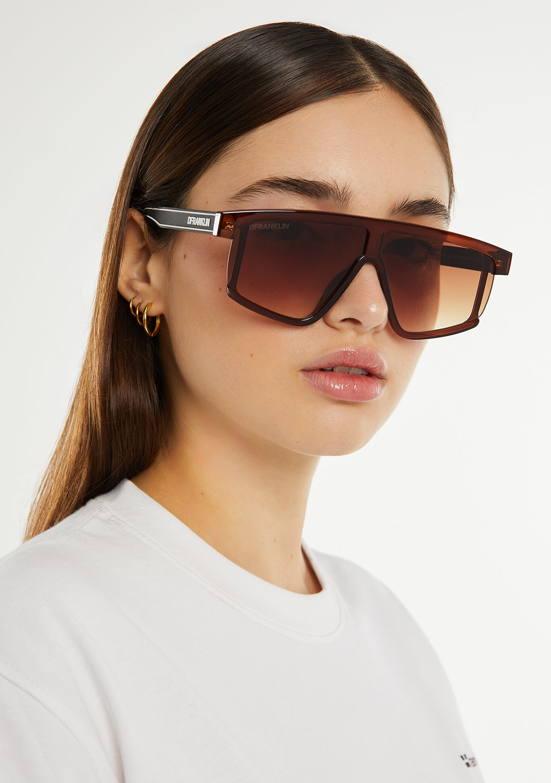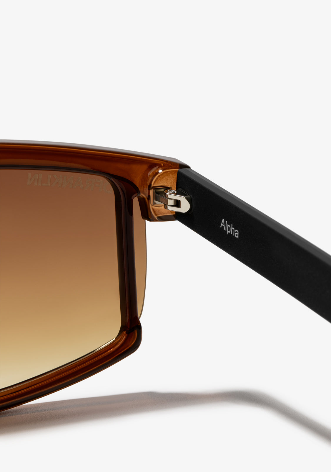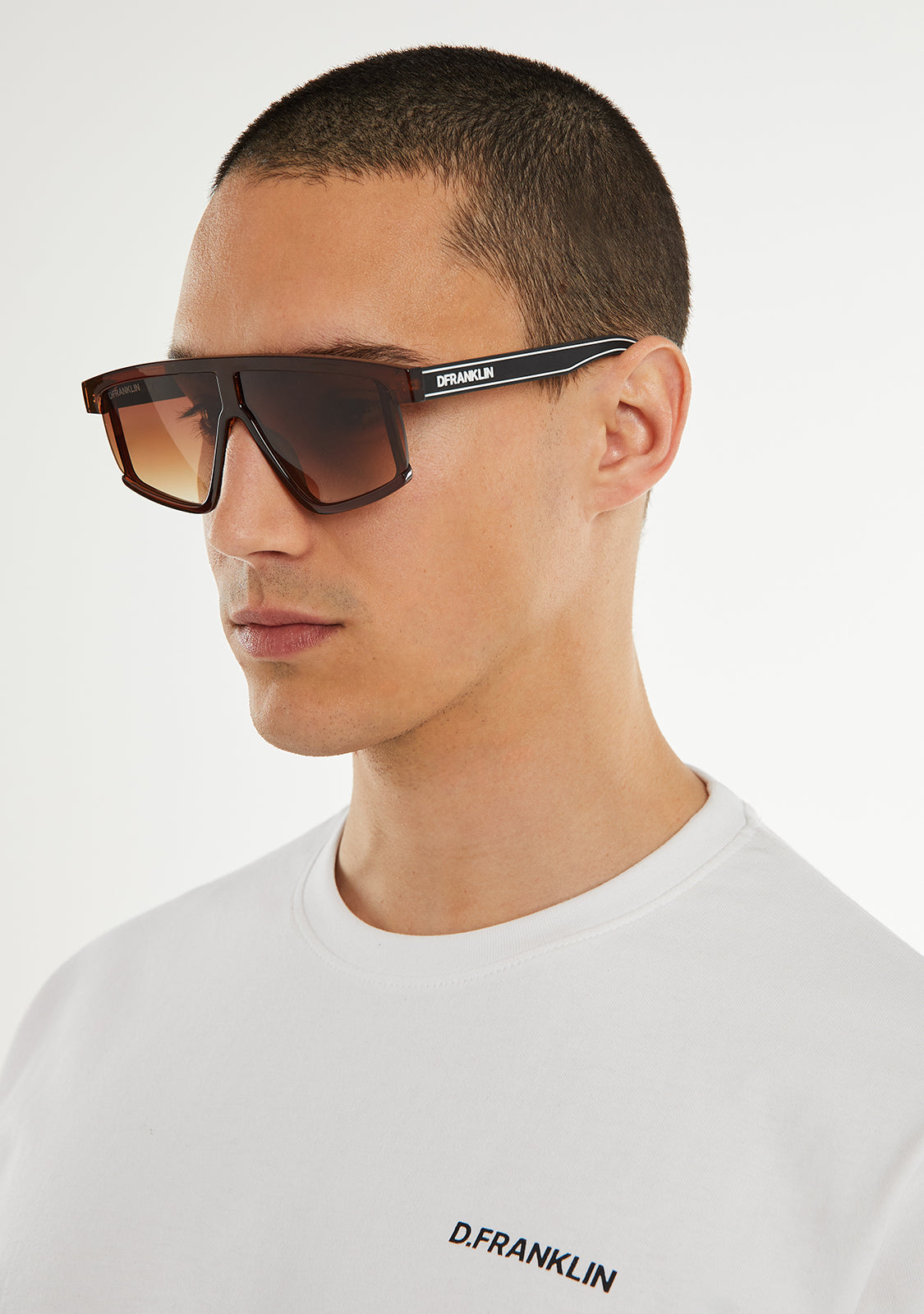Sus lentes de policarbonato teñidas en marrón y su montura a juego destacan la singularidad de este modelo. Cuenta con nuestros detalles distintivos D.Franklin: logo grabado en las varillas y emblema en la lente derecha. Con un ancho de lente de 65,5 mm y una marco frontal de 152 mm, estas gafas favorecen a la mayoría de los rostros. Las varillas laterales tienen una longitud de 150 mm.