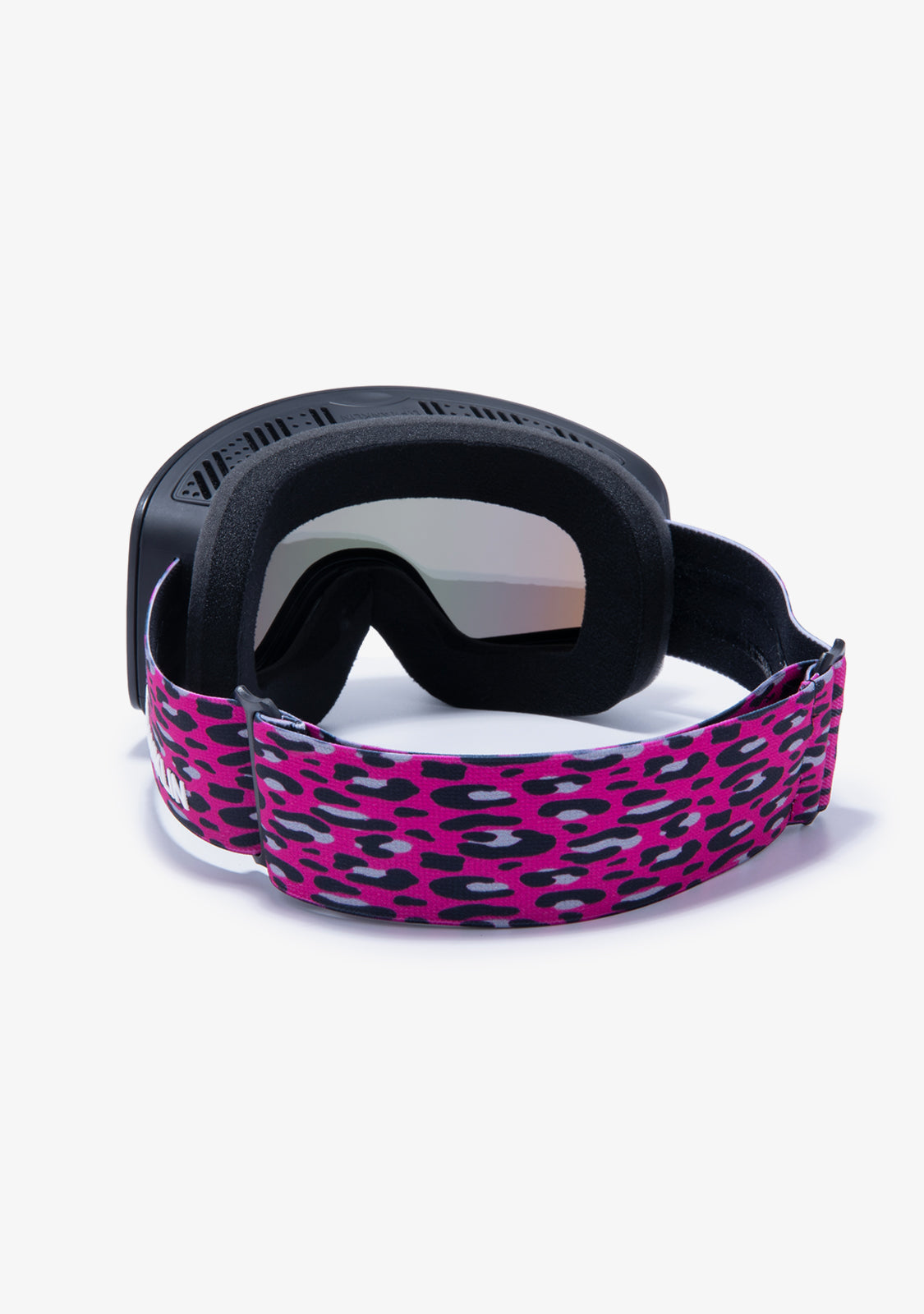 Este modelo inspirado en las cumbres cuenta con unas lentes de policarbonato efecto espejo sin límites ni marco. Presenta un acabado plateado, rosa y negro con nuestro distintivo emblema en el lateral de su banda elástica con estampado de leopardo. El ancho uniforme de lente es de 179.5 mm.