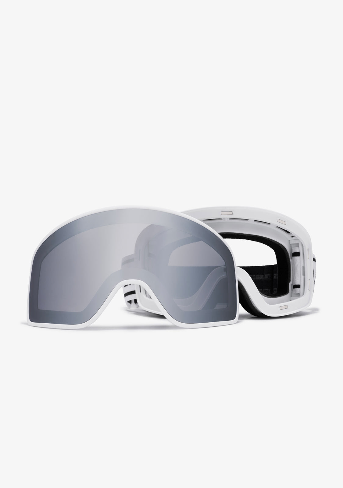 Este modelo inspirado en las cumbres cuenta con unas lentes de policarbonato efecto espejo sin límites ni marco. Presenta un acabado plateado y blanco con nuestro distintivo emblema en el lateral de su banda elástica blanca. El ancho uniforme de lente es de 179.5 mm.