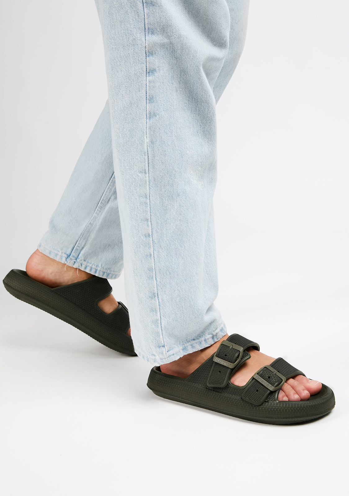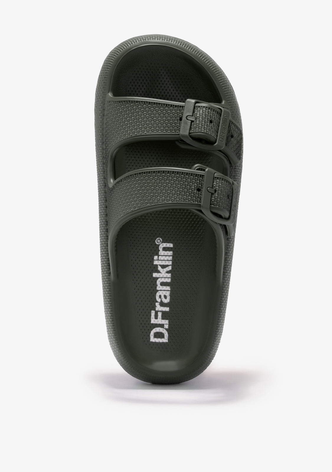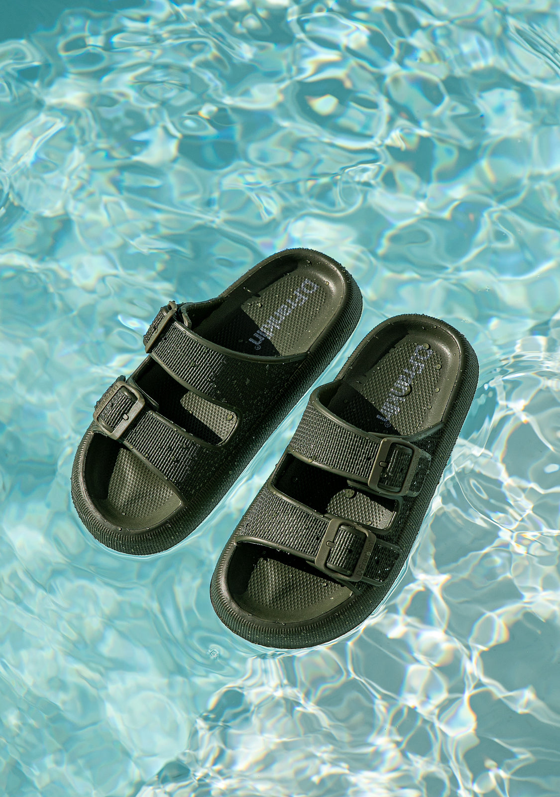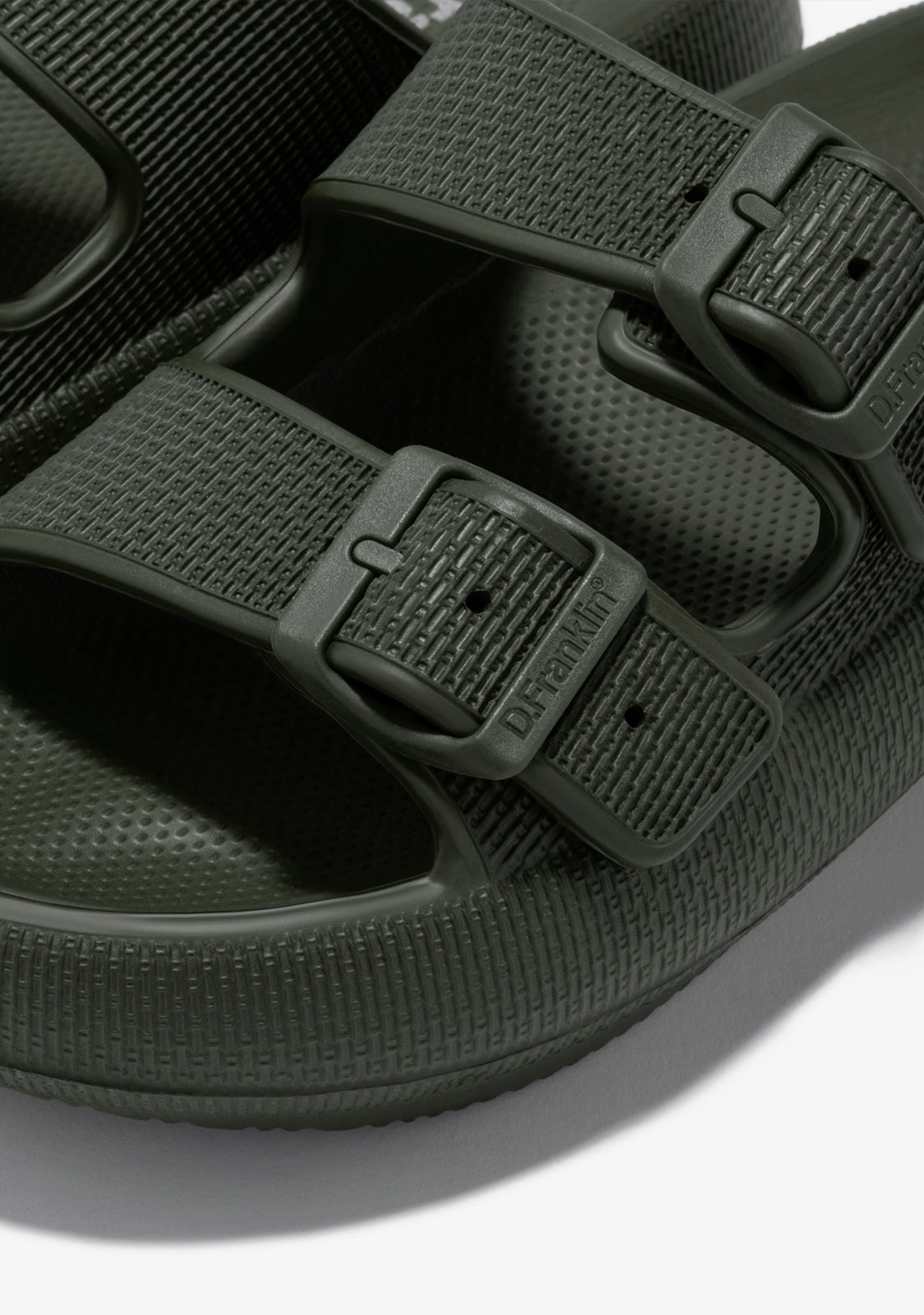Inspirada en el agua de Lago Verde, Lanzarote. Construidas con EVA para una pisada ligera. Diseñadas con silueta redondeada y cierre de hebilla doble en color verde caqui. Logotipo D.Franklin en la suela. Las sandalias Bloomer Bio son ligeramente pequeñas. Recomendamos escoger una talla más de la habitual.