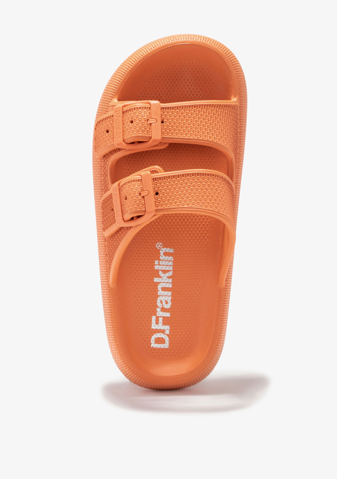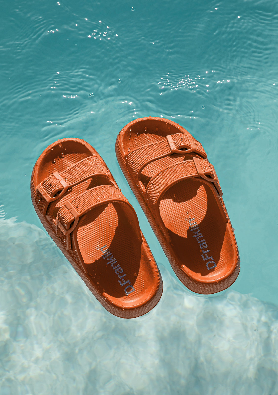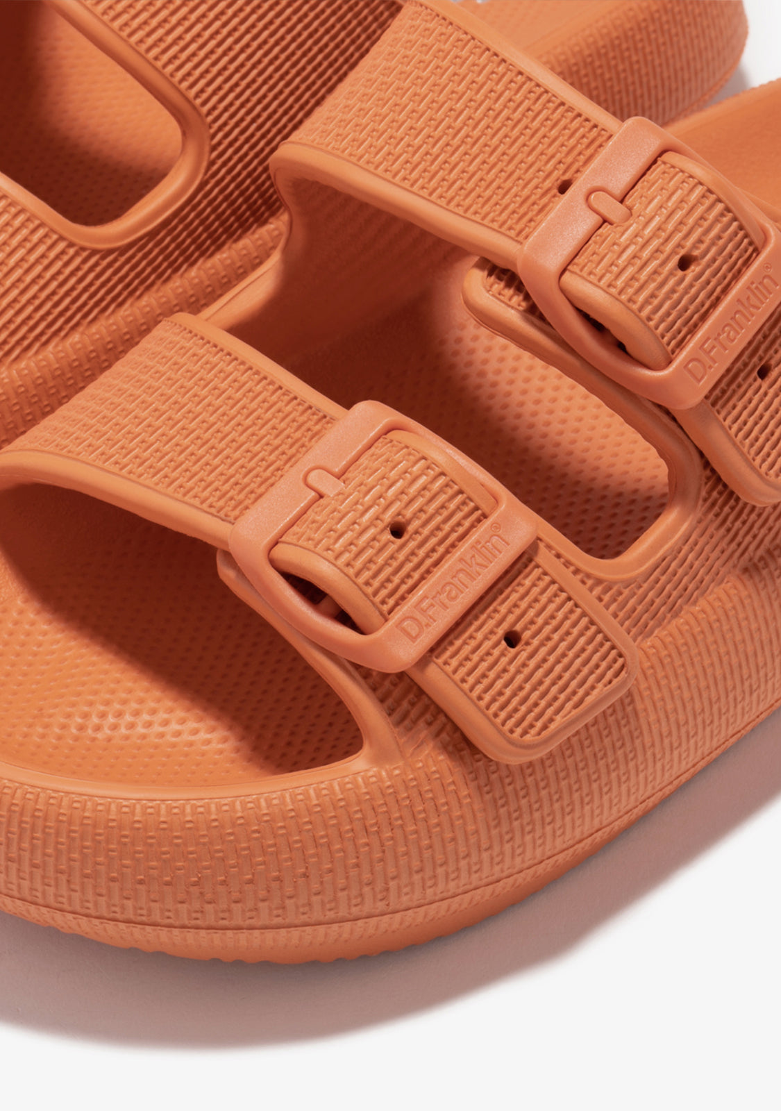 Inspiradas en los tonos del atardecer de South Beach, Miami. Construidas con EVA para una pisada ligera. Diseñadas con silueta redondeada y cierre de hebilla doble en color naranja. Logotipo D.Franklin en la suela. Las sandalias Bloomer Bio son ligeramente pequeñas. Recomendamos escoger una talla más de la habitual.