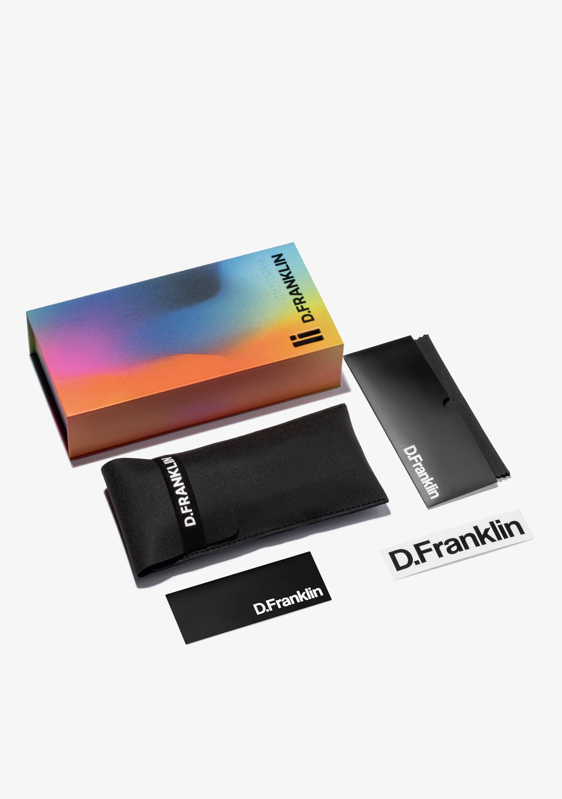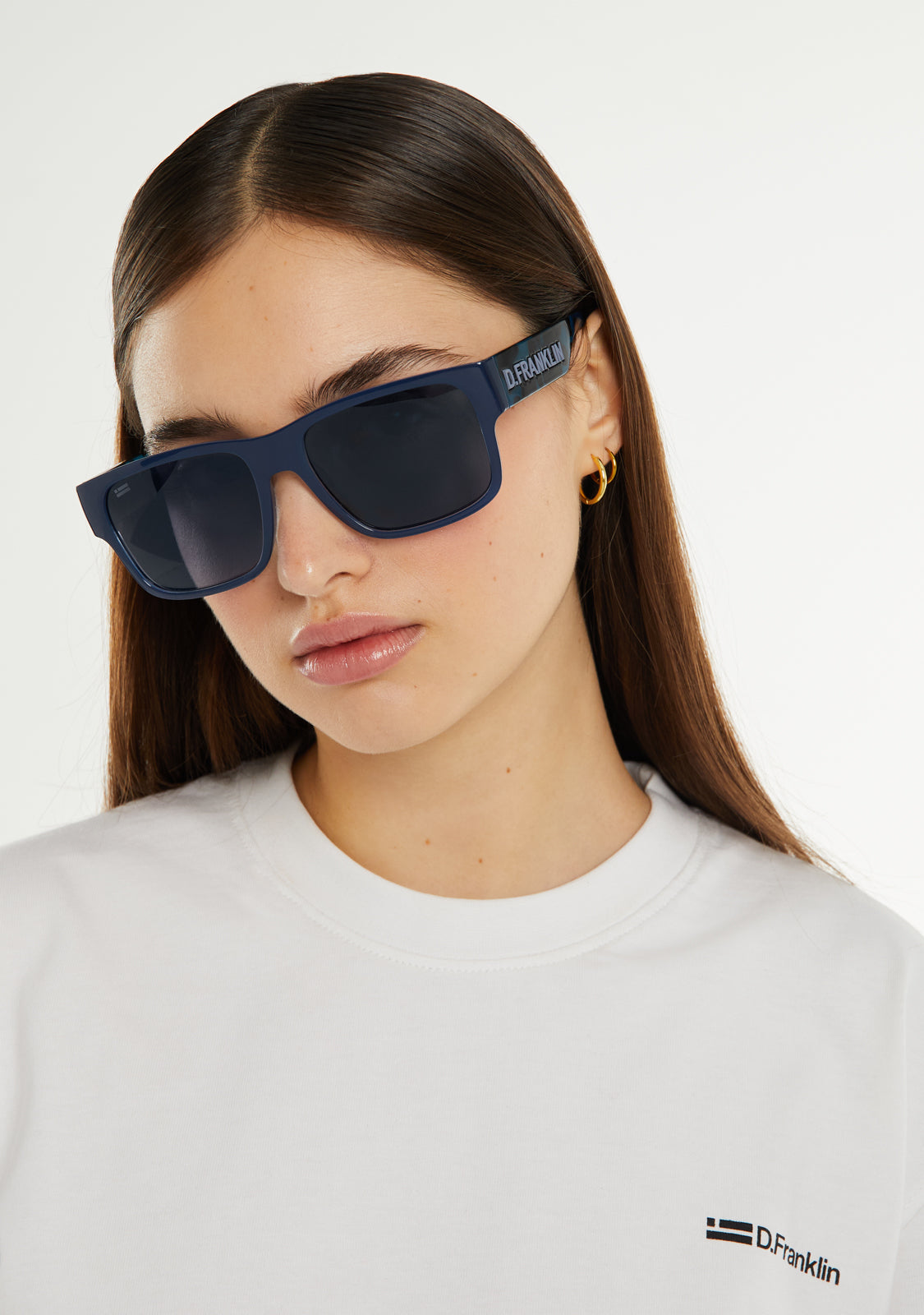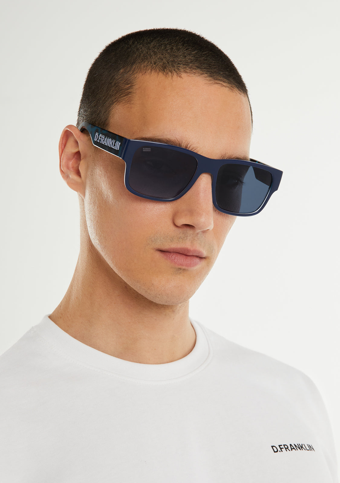 Gafas de sol D.Franklin California. Un modelo diseñado en tono azul y detalles vibrantes. Creado con nuestros detalles distintivos D.Franklin: logo grabado en ambas varillas y emblema en la lente derecha. Su ancho de lente es de 57 mm y su frontal de 148 mm. Las varillas laterales tienen una longitud de 145 mm.
