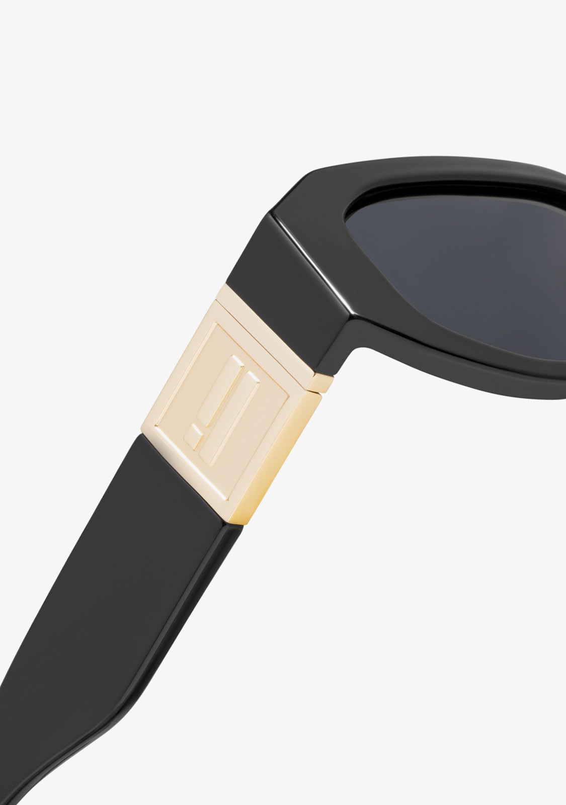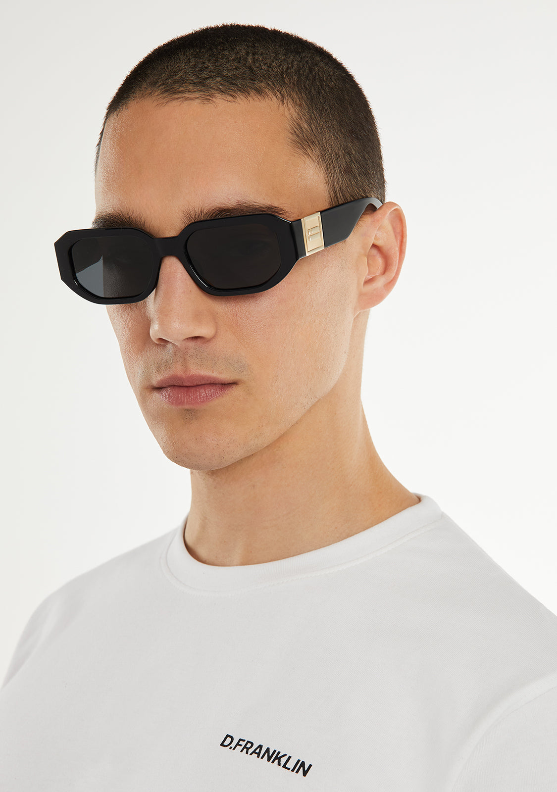 Sus lentes polarizadas en tono oscuro y su montura a juego resaltan la singularidad de este diseño. Cuenta con nuestra distintiva bandera D.Franklin con un acabado dorado metalizado en ambas patillas. El ancho de lente de 52 mm y el marco frontal de 139 mm quedan unidos mediante una varilla asimétrica de 140 mm.