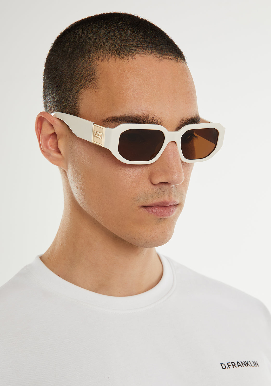 Sus lentes polarizadas en tono marrón y su montura blanca resaltan la singularidad de este diseño. Cuenta con nuestra distintiva bandera D.Franklin con un acabado dorado metalizado en ambas patillas. El ancho de lente de 52 mm y el marco frontal de 139 mm quedan unidos mediante una varilla asimétrica de 140 mm.