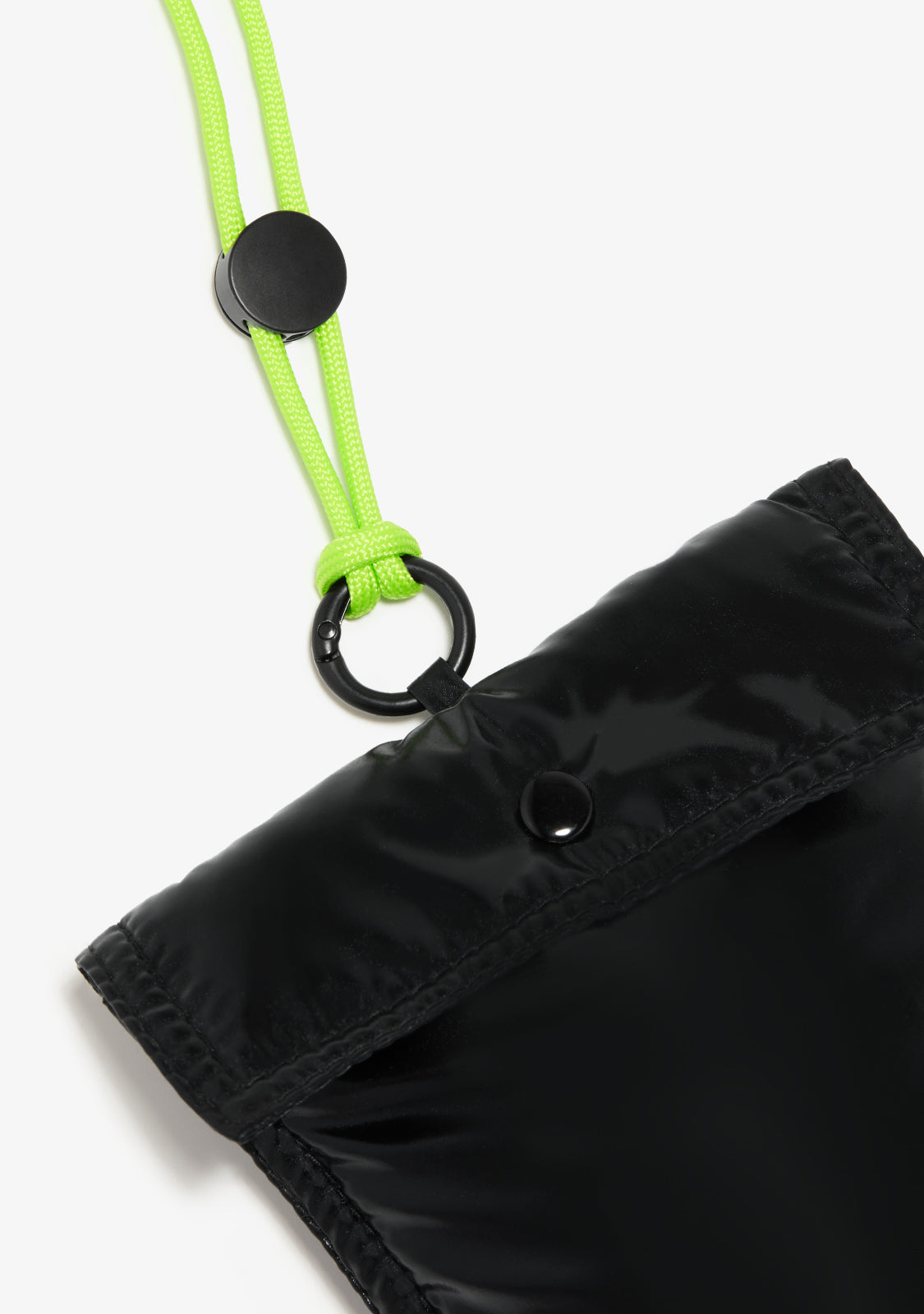 Este modelo con acabado negro iridiscente tiene un cordón color lima extraíble gracias a su aro metálico que permite adaptar su longitud. Cuenta con cierre de botón y logo D.Franklin serigrafiado en color lima en la parte delantera.
