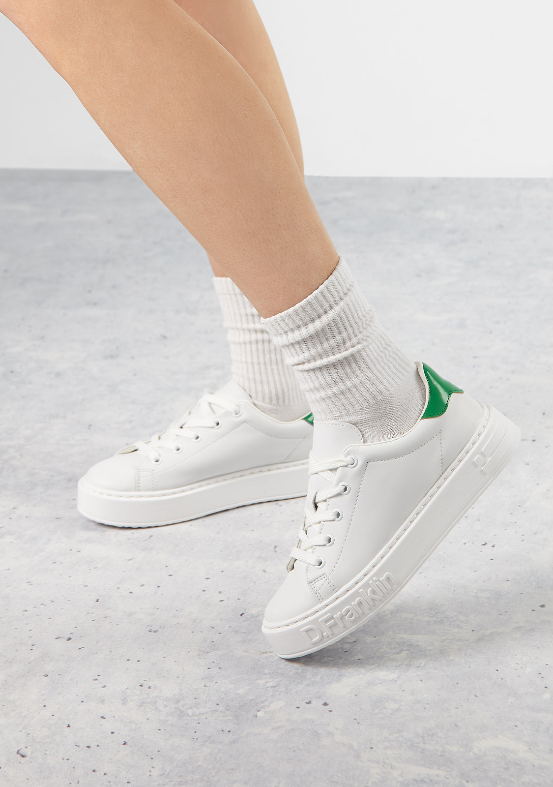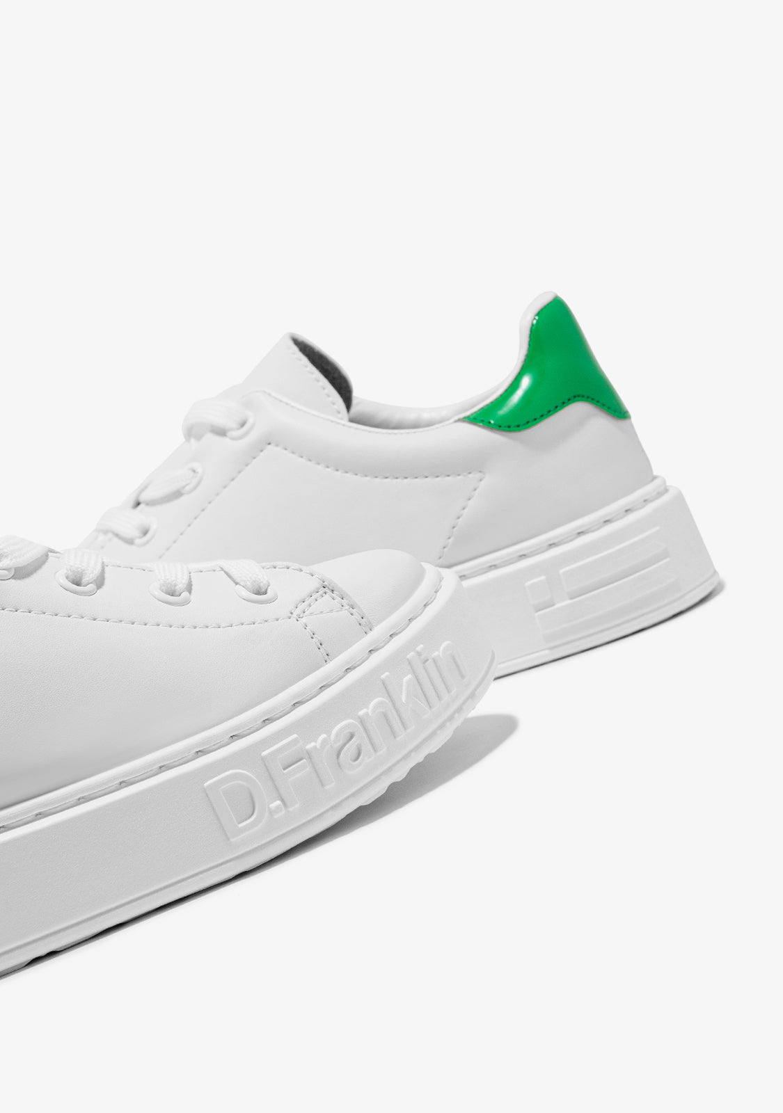 Las zapatillas D.Franklin Gumme 101 respiran la energía de las grandes capitales con un diseño sencillo de piel sintética en blanco y detalles verdes. Cuenta con un piso de 3,5 cm de altura que permite una amortiguación ligera en cada paso. Con cordones de algodón regulables para una sujeción perfecta.