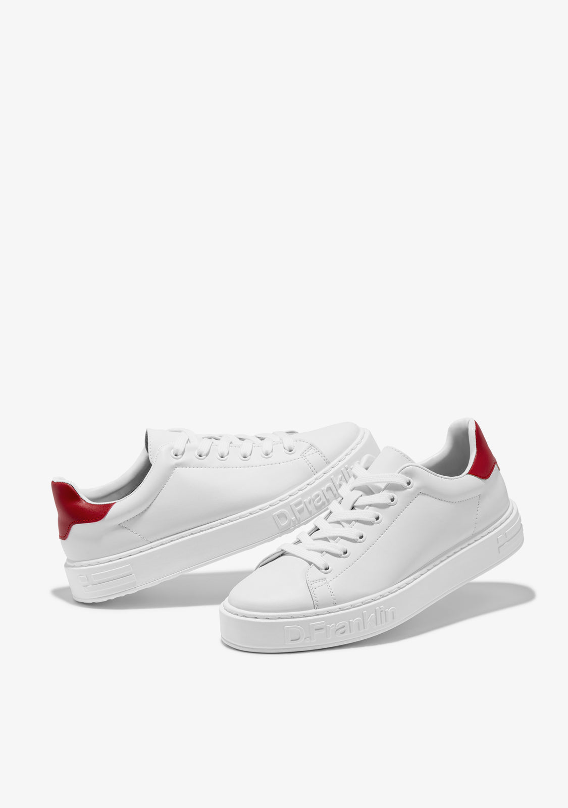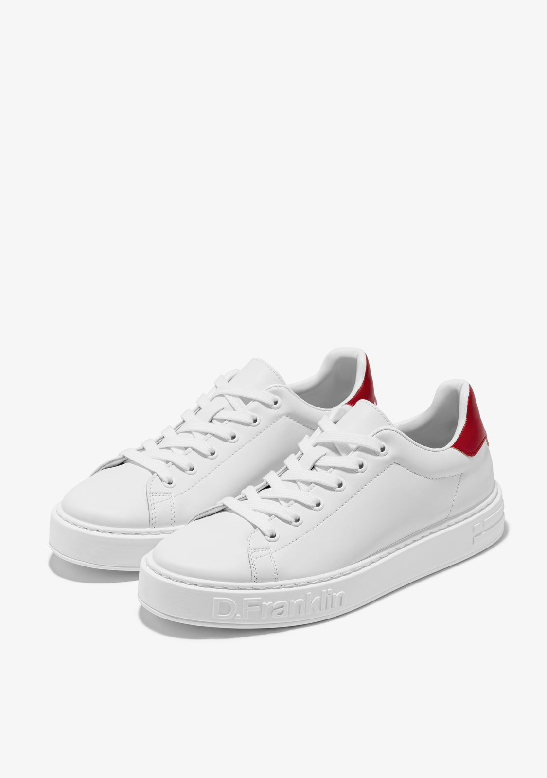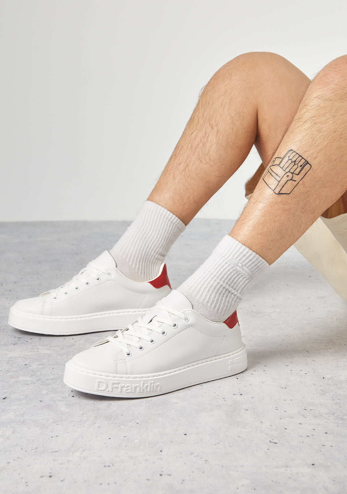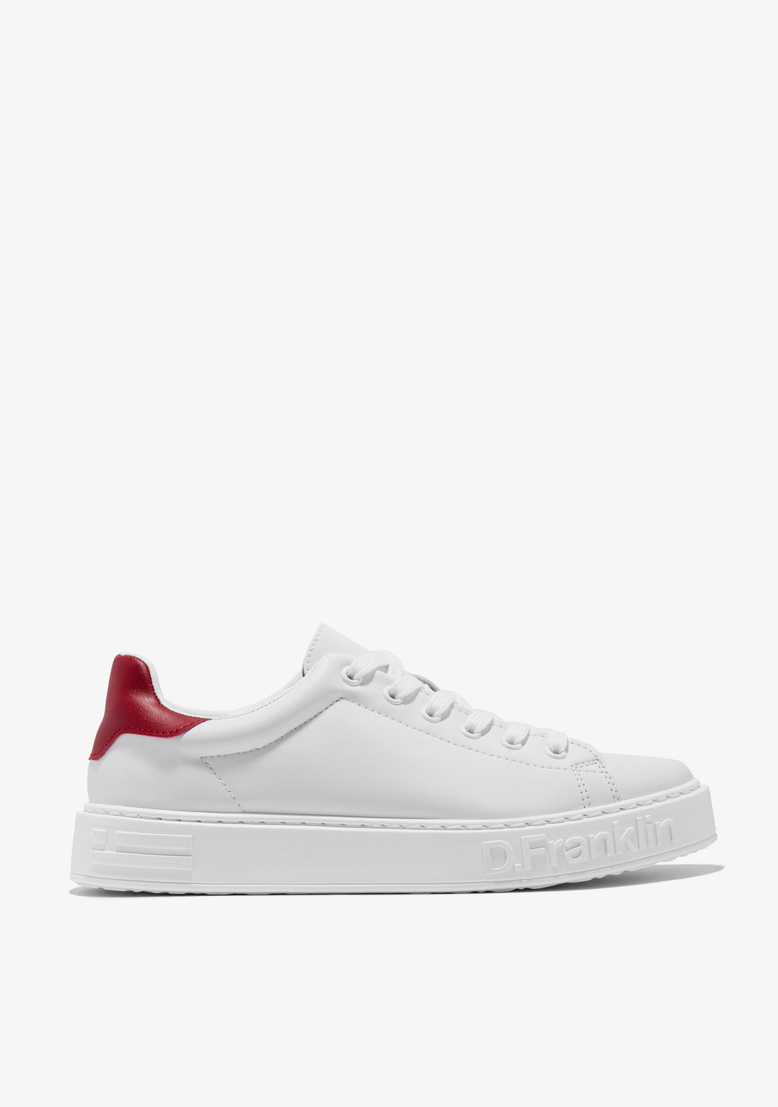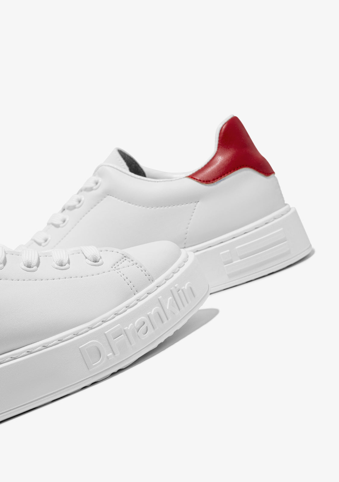 Las zapatillas D.Franklin Gumme 101 respiran la energía de las grandes capitales con un diseño sencillo de piel sintética en blanco y detalles rojos. Cuenta con un piso de 3,5 cm de altura que permite una amortiguación ligera en cada paso. Con cordones de algodón regulables para una sujeción perfecta.