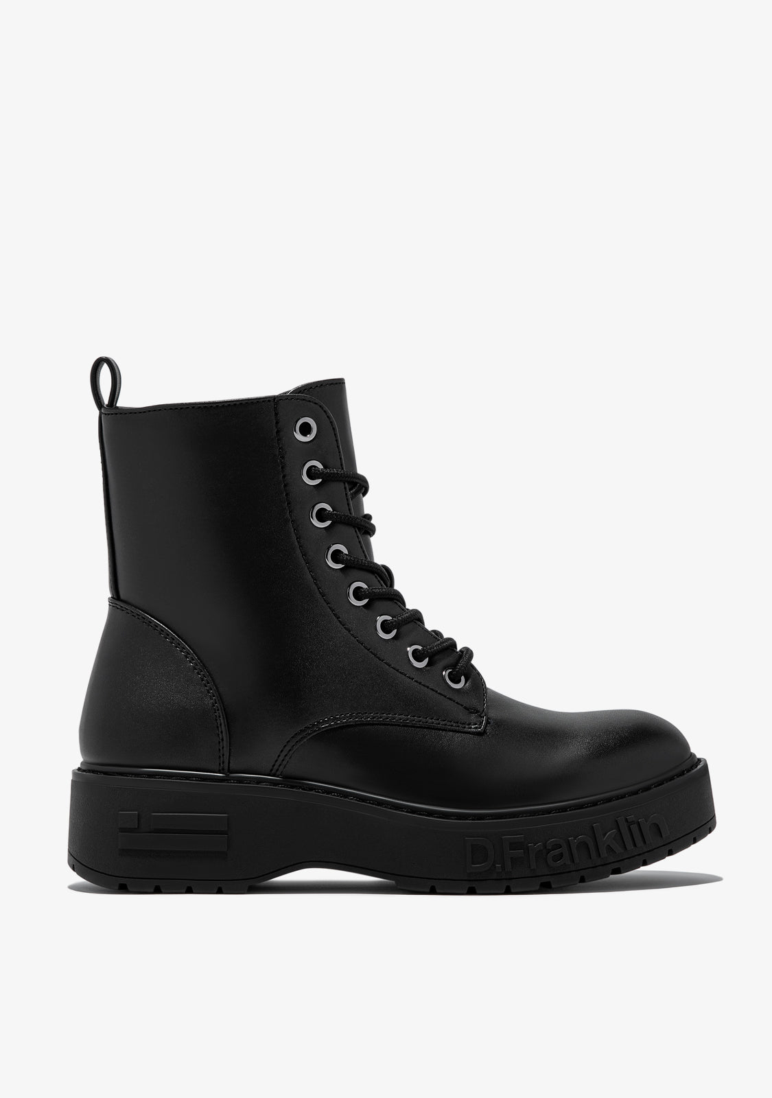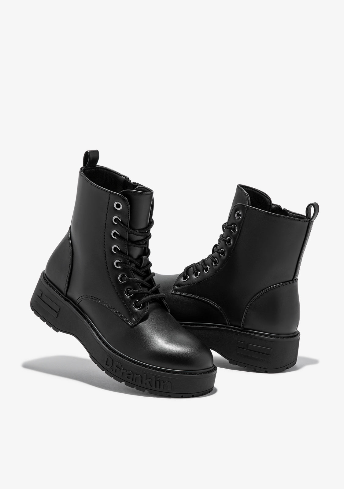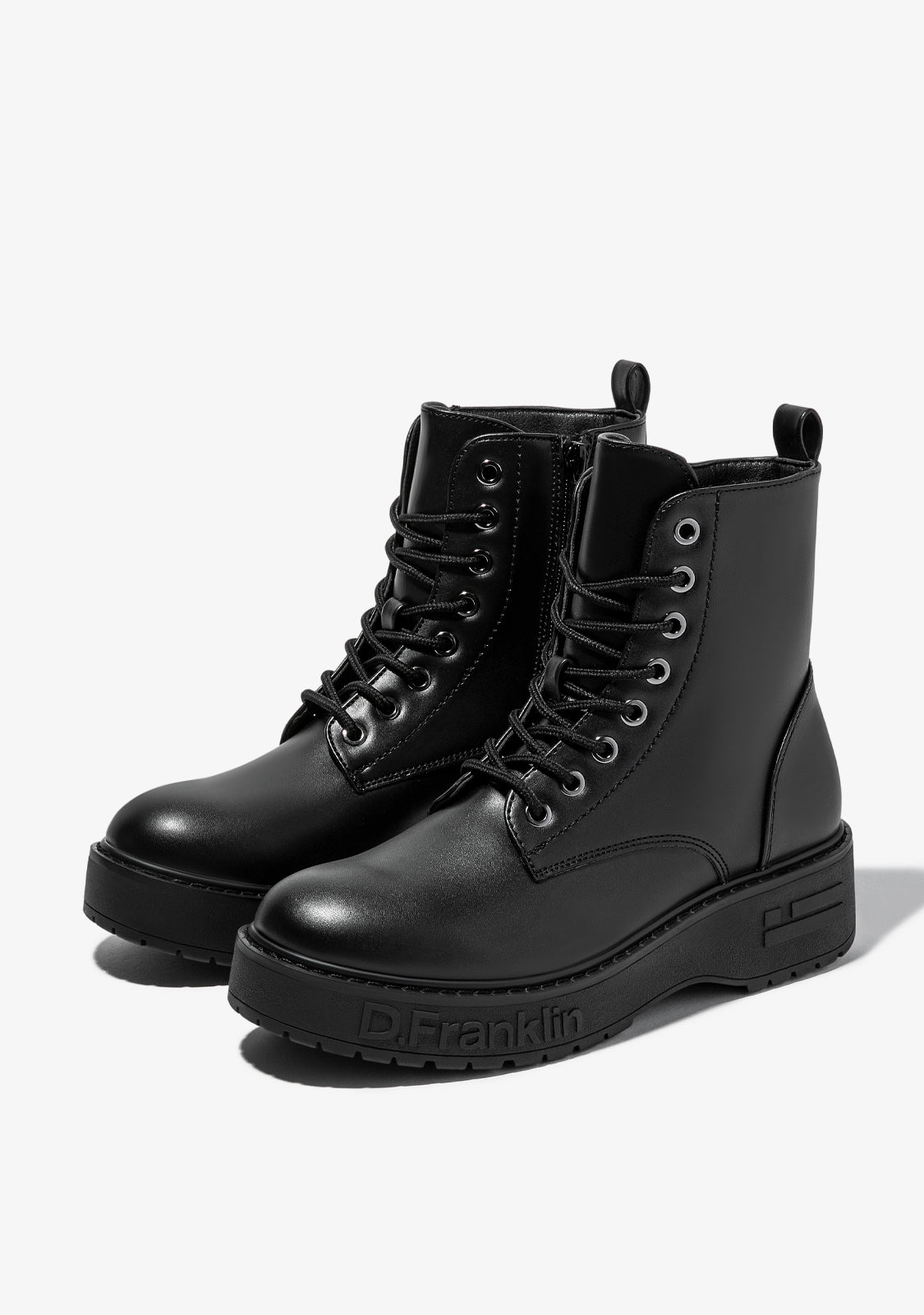 Este modelo D.Franklin en tono negro presenta una cremallera interior en uno de sus laterales y cordones de algodón ajustables. Su suela estilo track permite un agarre inigualable. Además, cuenta con personalización en relieve de nuestro logo y emblema en su cuña y puntera.