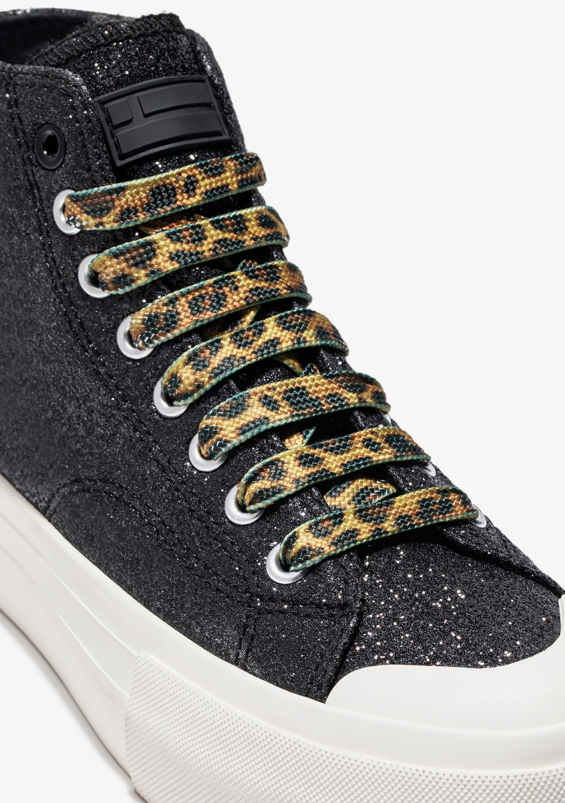 Este modelo está diseñado con print animal de leopardo en tonos ocres y marrones. Cuenta con herretes de plástico a juego en sus extremos que permiten un ajuste perfecto y evitan que los cordones se desgasten o deshilachen con mayor facilidad.