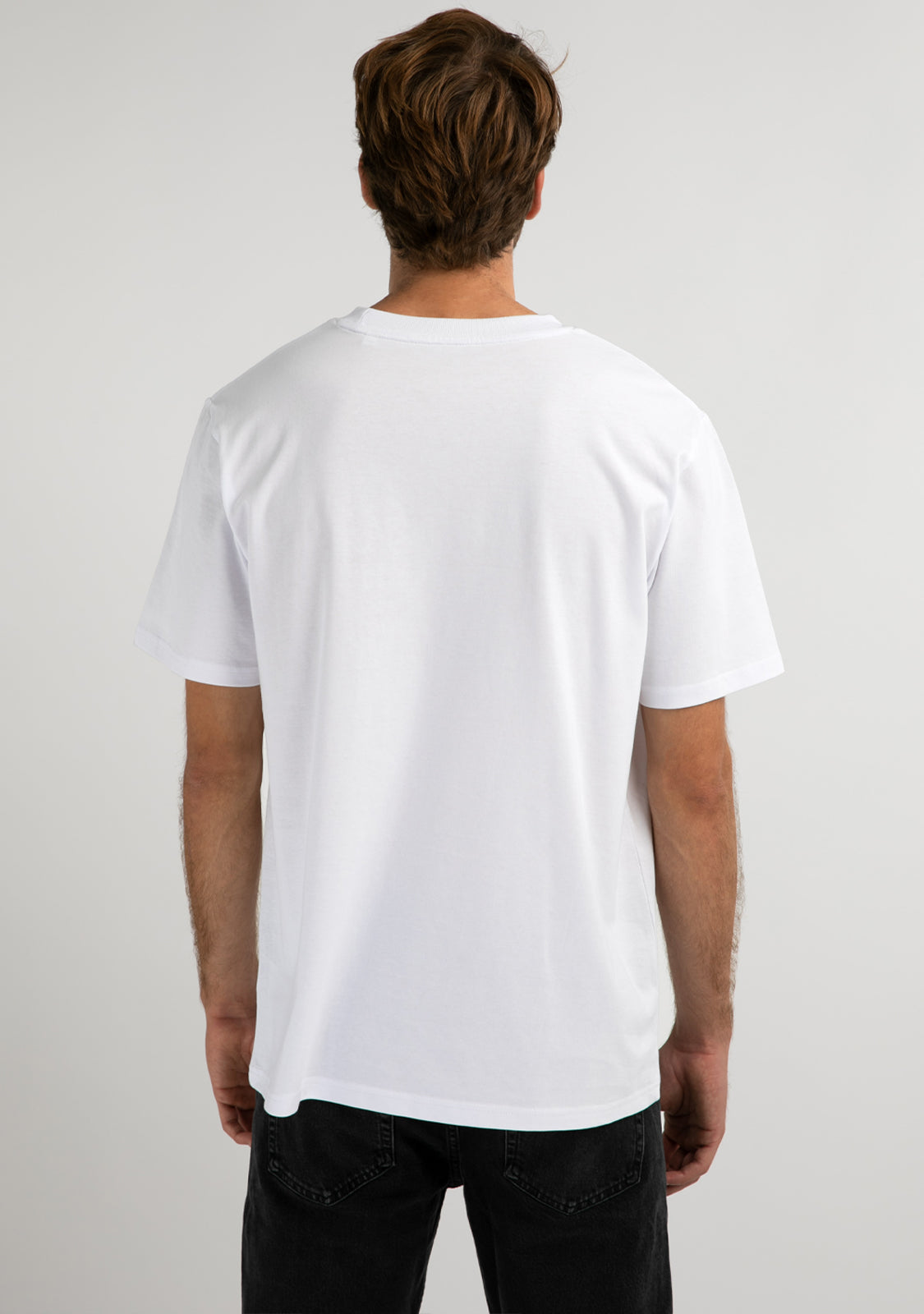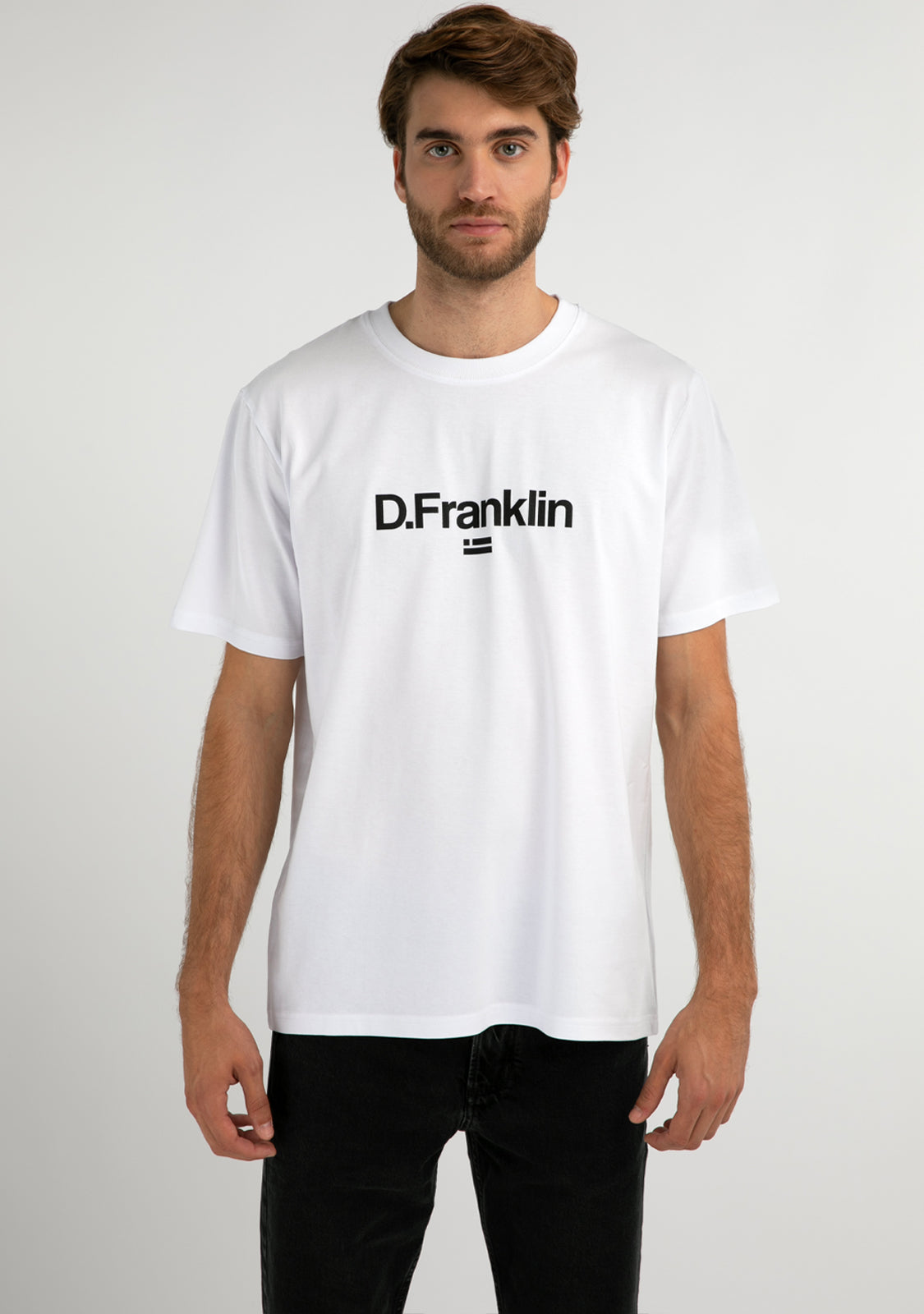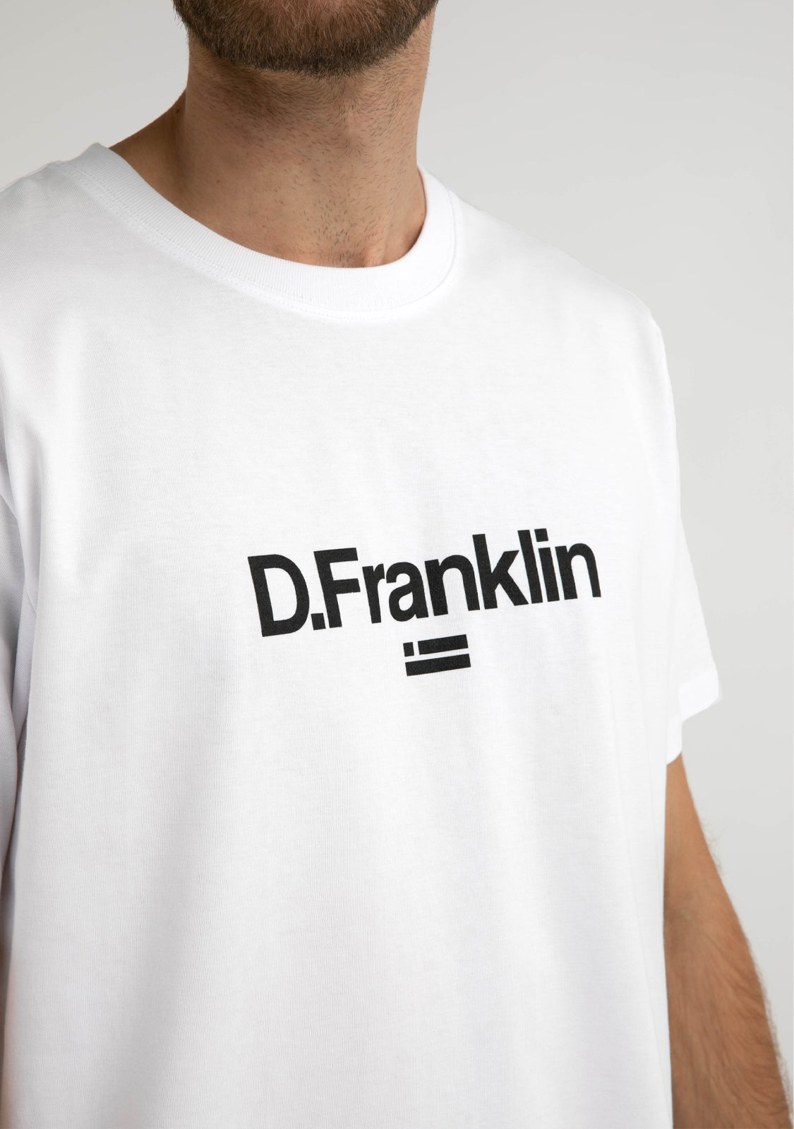 Camiseta blanca que simplifica la iconografía de D.Franklin dotada con el logo y emblema de nuestra marca en el pecho en color negro. Cuello redondo con puntada doble. Confeccionada con algodón 100% orgánico.