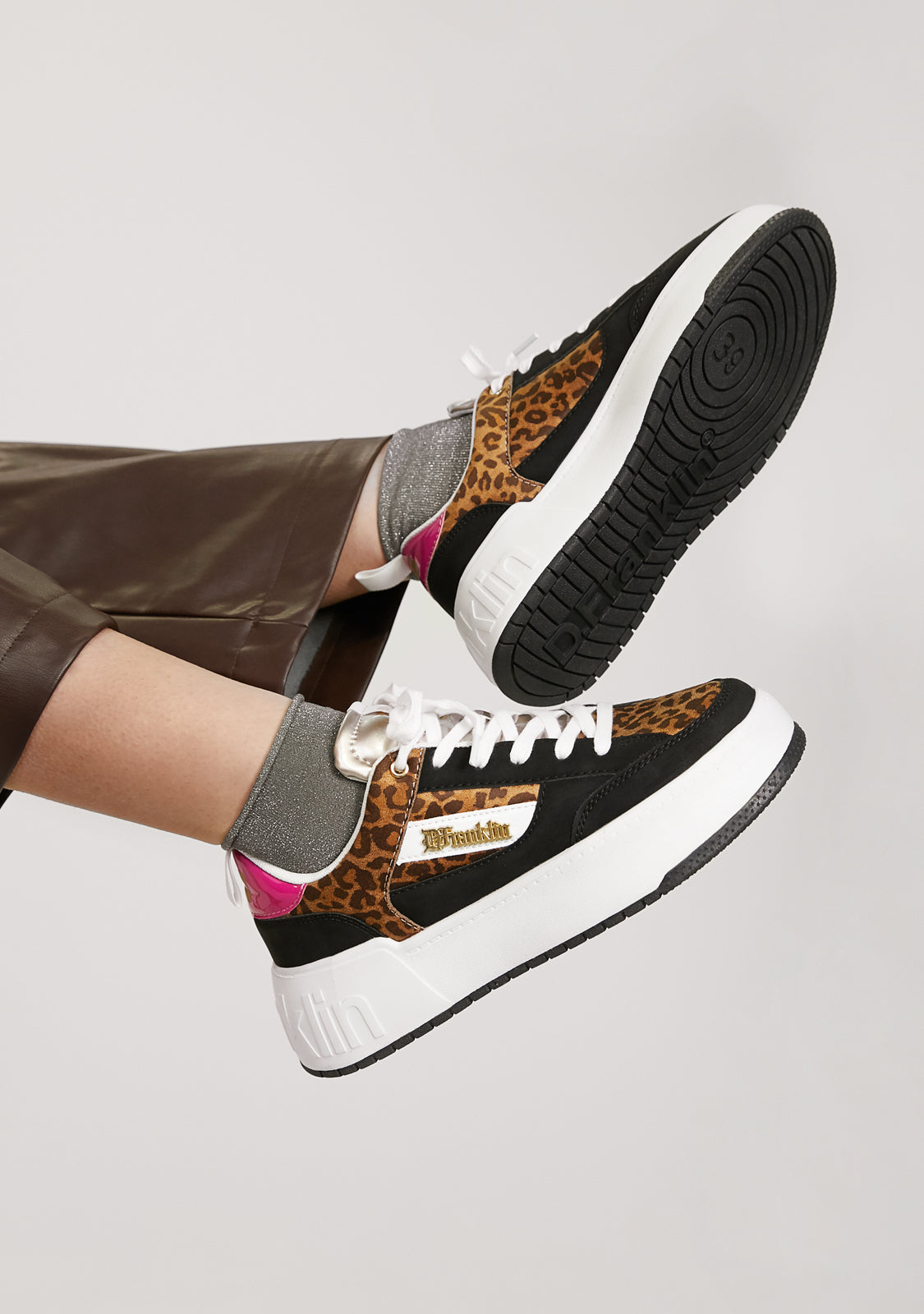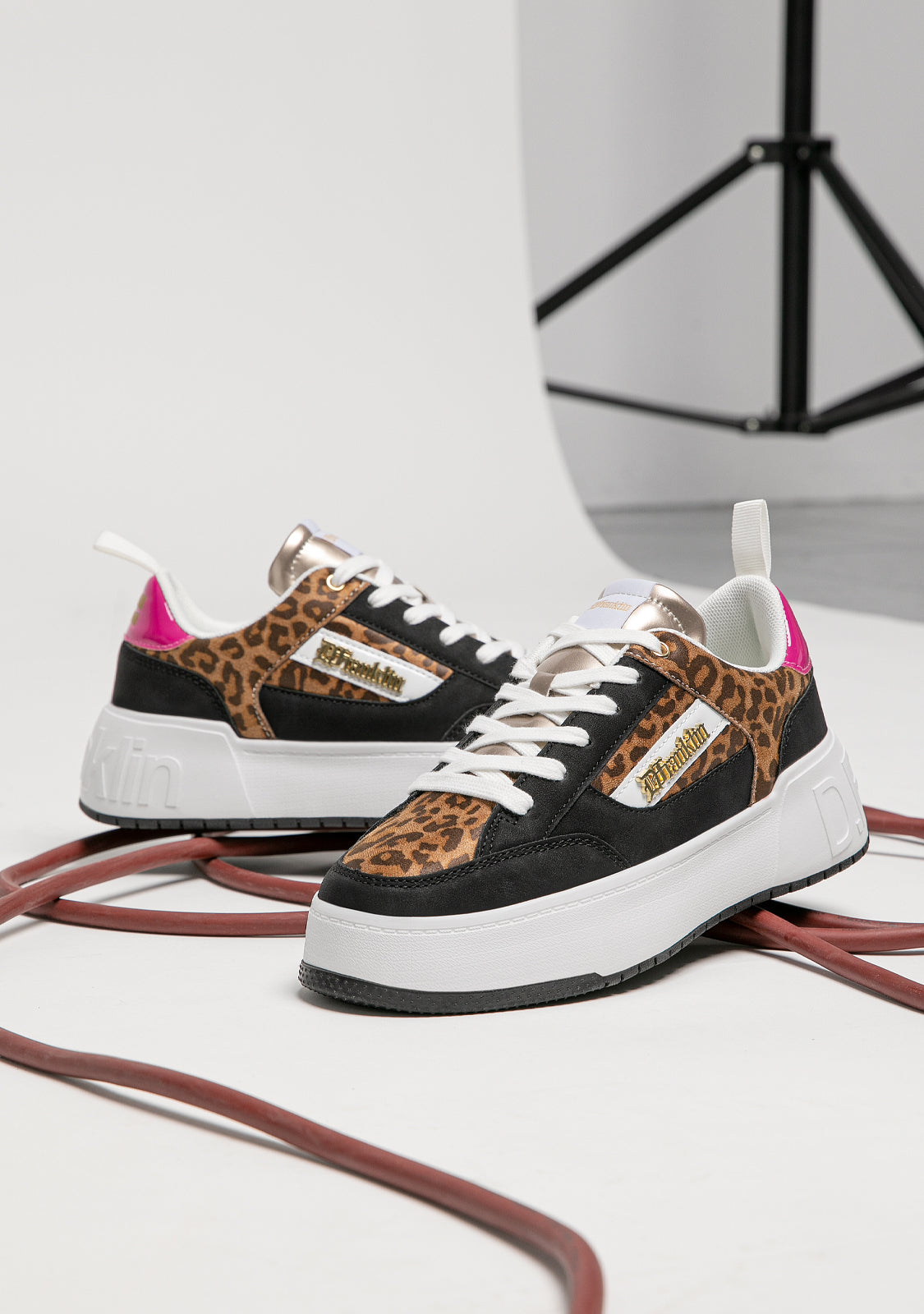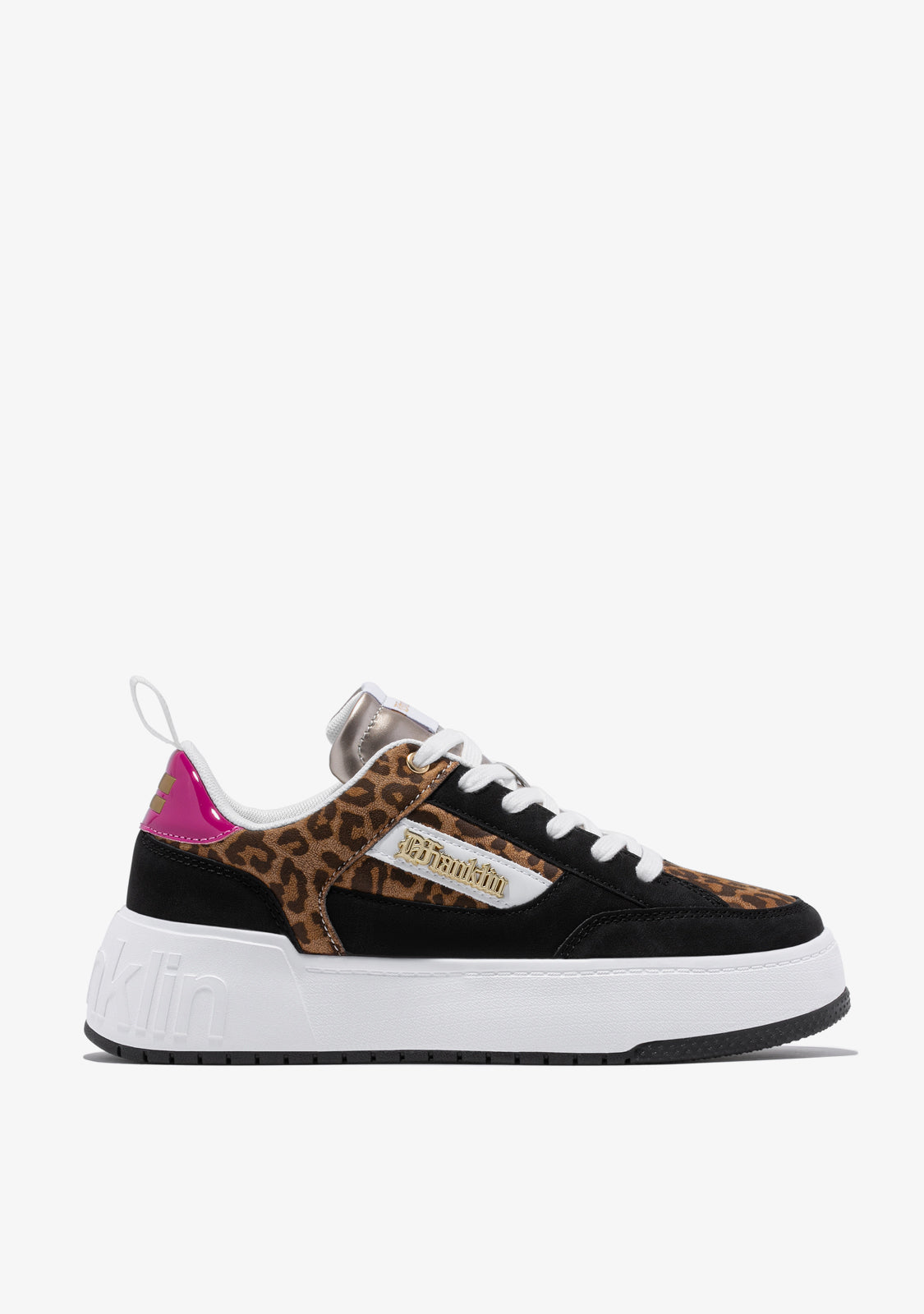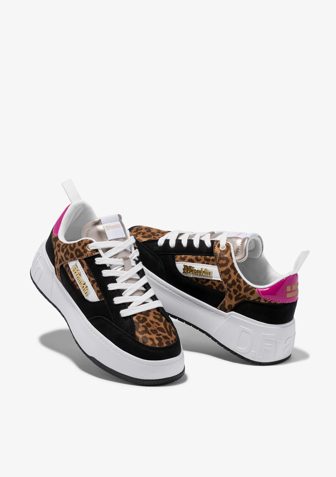 Diseñadas para volver a sentir la adrenalina de nuestra icónica zapatilla Court. Un modelo inspirado en la tendencia basket de los años 90. Contraste animal print en su empeine y laterales. Talón fucsia y elementos en color negro. Construidas con suela de goma y piel sintética vegana. Logo en relieve D.Franklin en talón. Cordoneras en algodón. Suela de 4 cm.