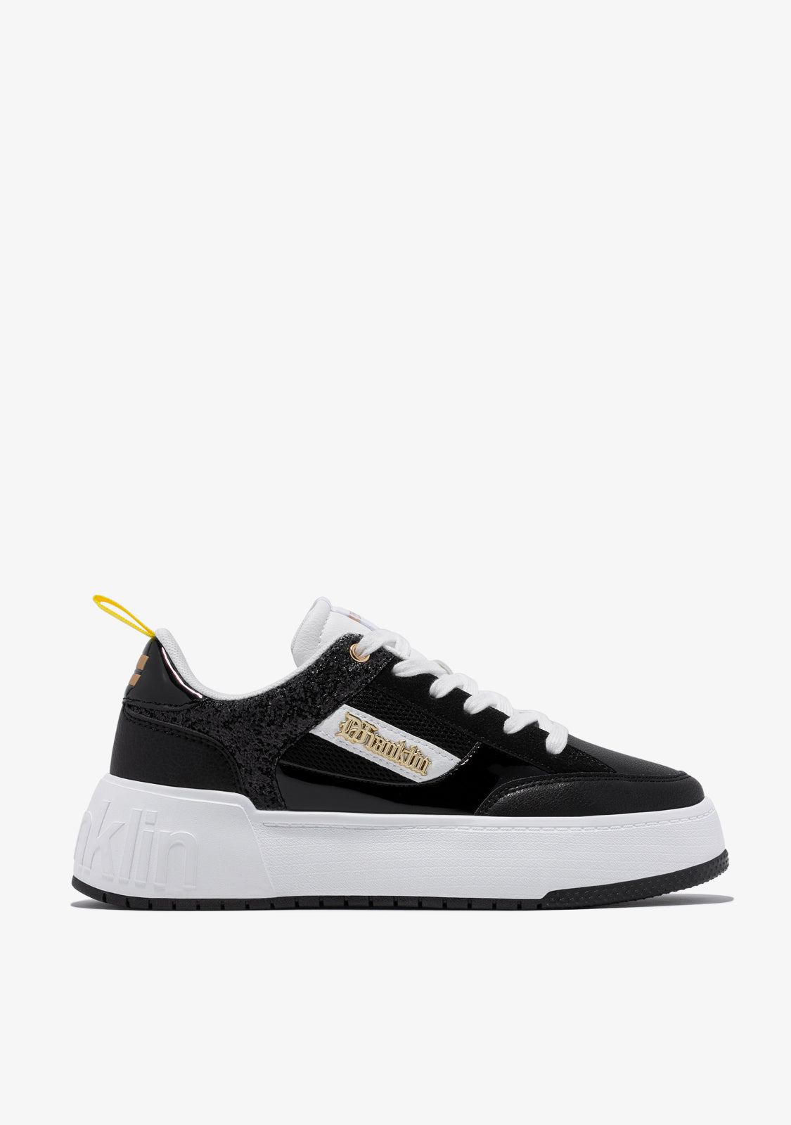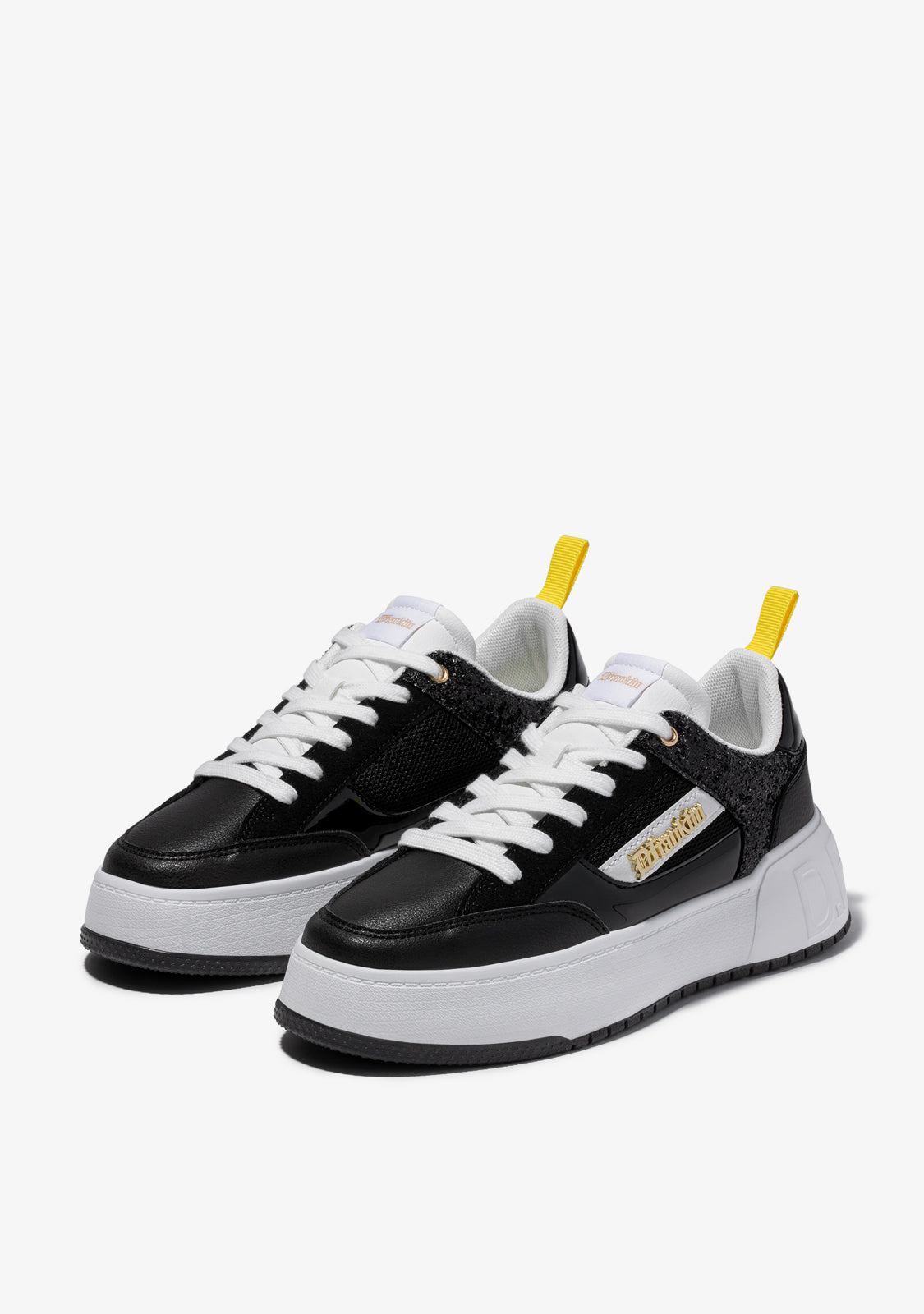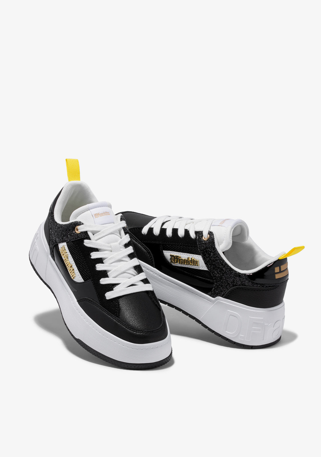 Diseñadas para volver a sentir la adrenalina de nuestra icónica zapatilla Court. Un modelo inspirado en la tendencia basket de los años 90. Con purpurina en color negro para redefinir lo clásico. El icónico emblema D.Franklin en dorado sobre piel sintética vegana en blanco. Construidas con suela de goma. Logo en relieve D.Franklin en talón. Cordoneras en algodón. Suela de 4 cm.