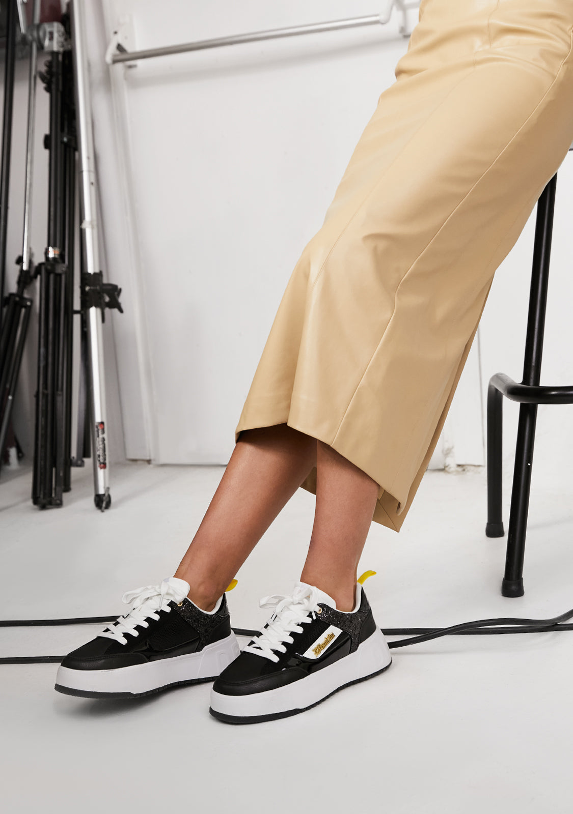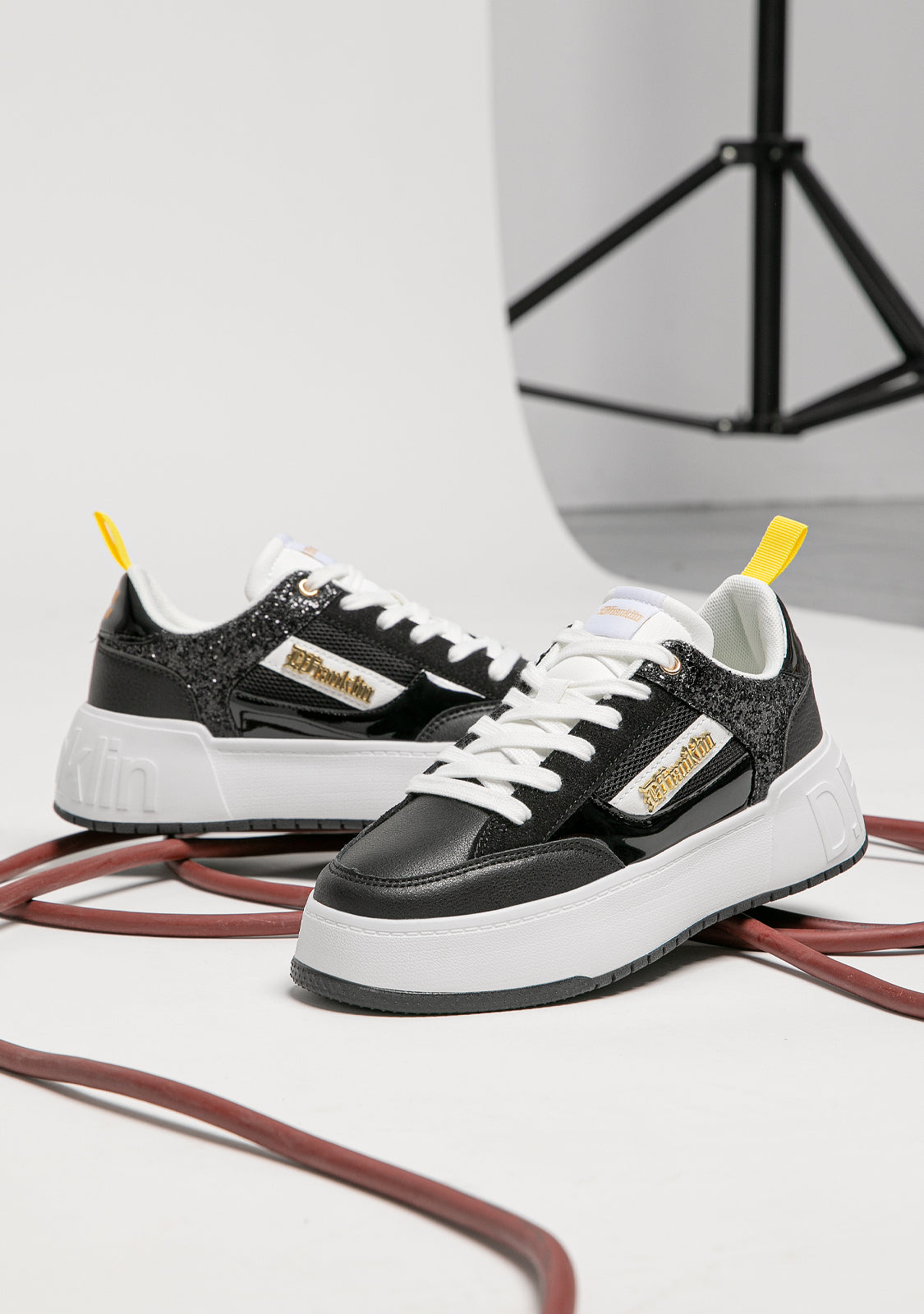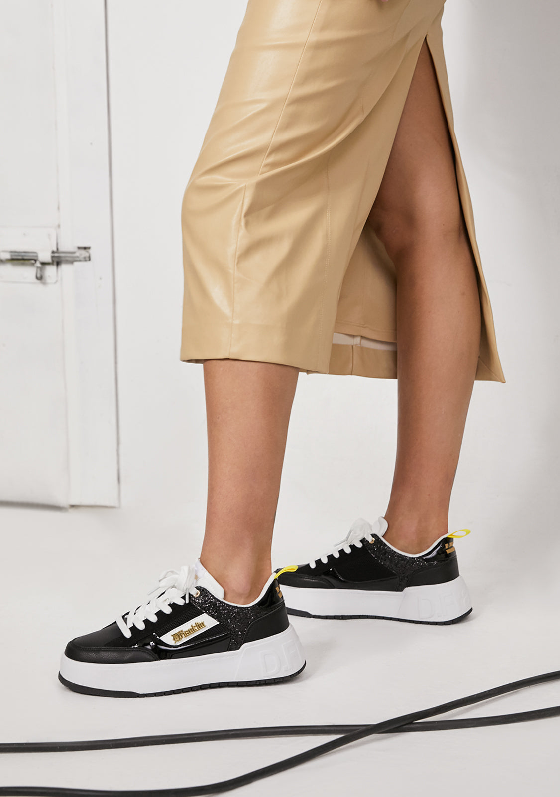 Diseñadas para volver a sentir la adrenalina de nuestra icónica zapatilla Court. Un modelo inspirado en la tendencia basket de los años 90. Con purpurina en color negro para redefinir lo clásico. El icónico emblema D.Franklin en dorado sobre piel sintética vegana en blanco. Construidas con suela de goma. Logo en relieve D.Franklin en talón. Cordoneras en algodón. Suela de 4 cm.