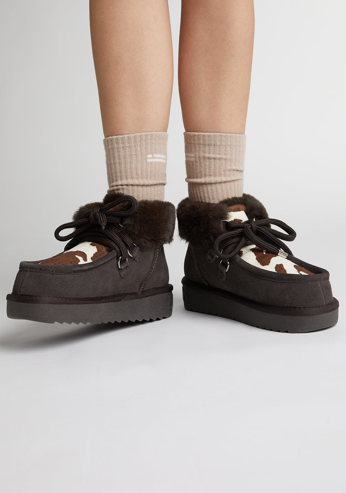 La suela de goma asegura estabilidad y agarre en superficies resbaladizas. Los cordones de tamaño XL no solo ofrecen un ajuste seguro, sino que también aportan un look original que las diferencia del resto. Hechas en serraje de alta calidad, son botas pensadas para acompañarte muchos inviernos Además, el exterior incorpora un estampado de vaca, que añade un toque único y original a tu armario de invierno.