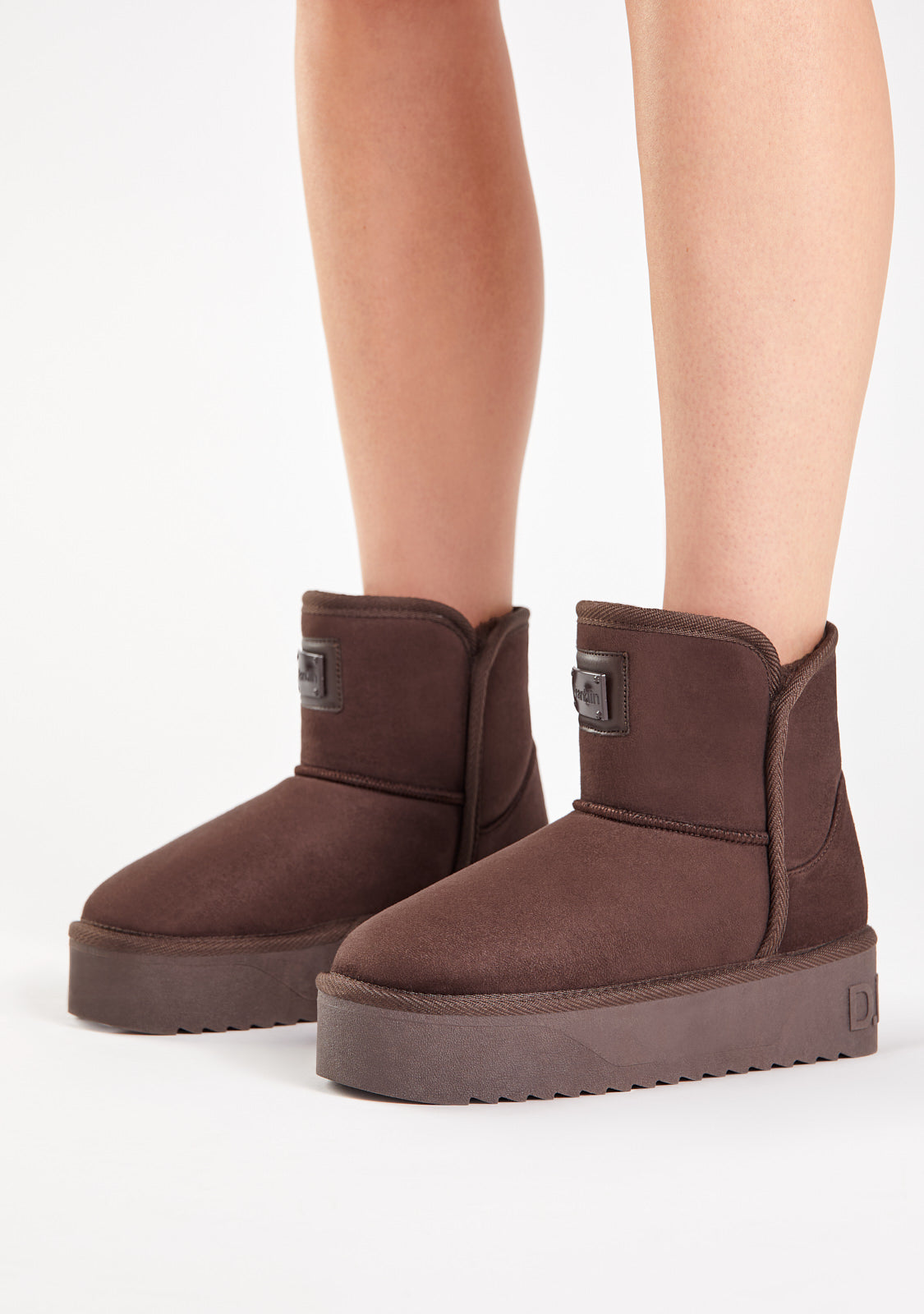 Diseño con corte asimétrico en tono marrón y forro interior sintético para una calidez superior.