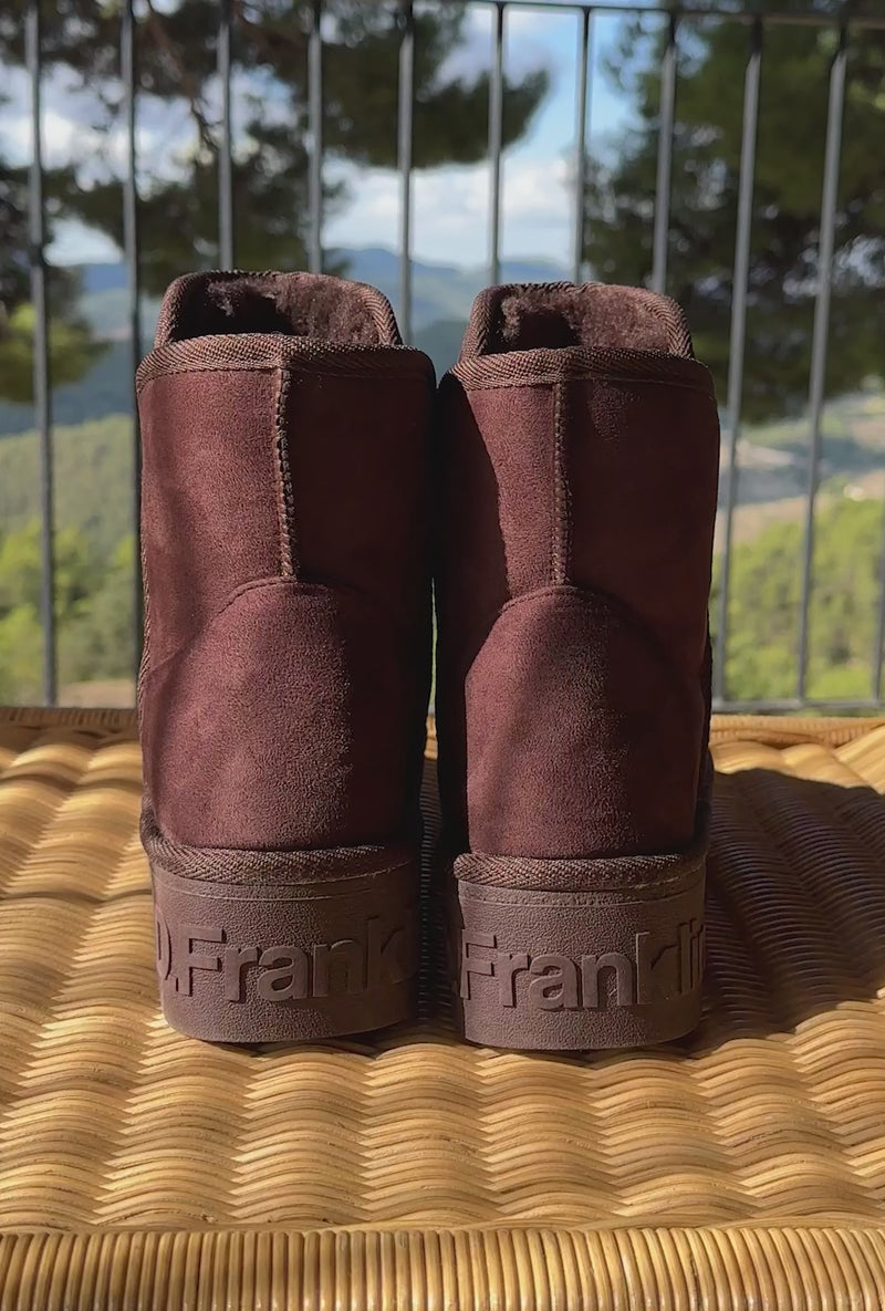 Diseño con corte asimétrico en tono marrón y forro interior sintético para una calidez superior. Creadas a través de materiales con certificación PETA Approved-Vegan.