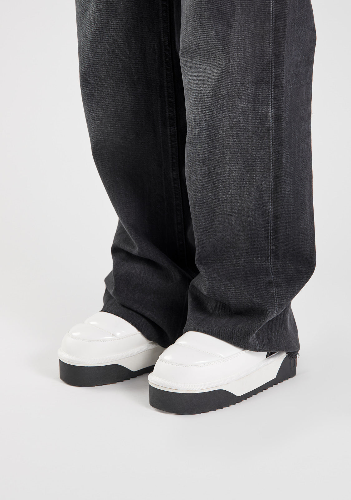Diseño de caña con corte recto en tonos blancos, estética brillante y forro interior sintético para una calidez superior.