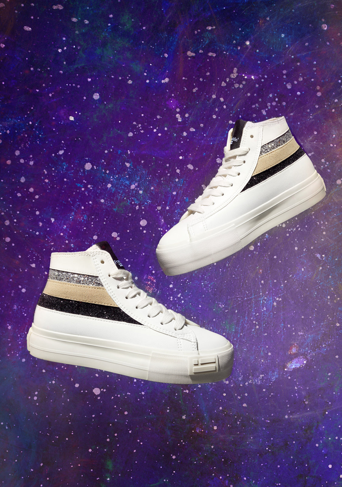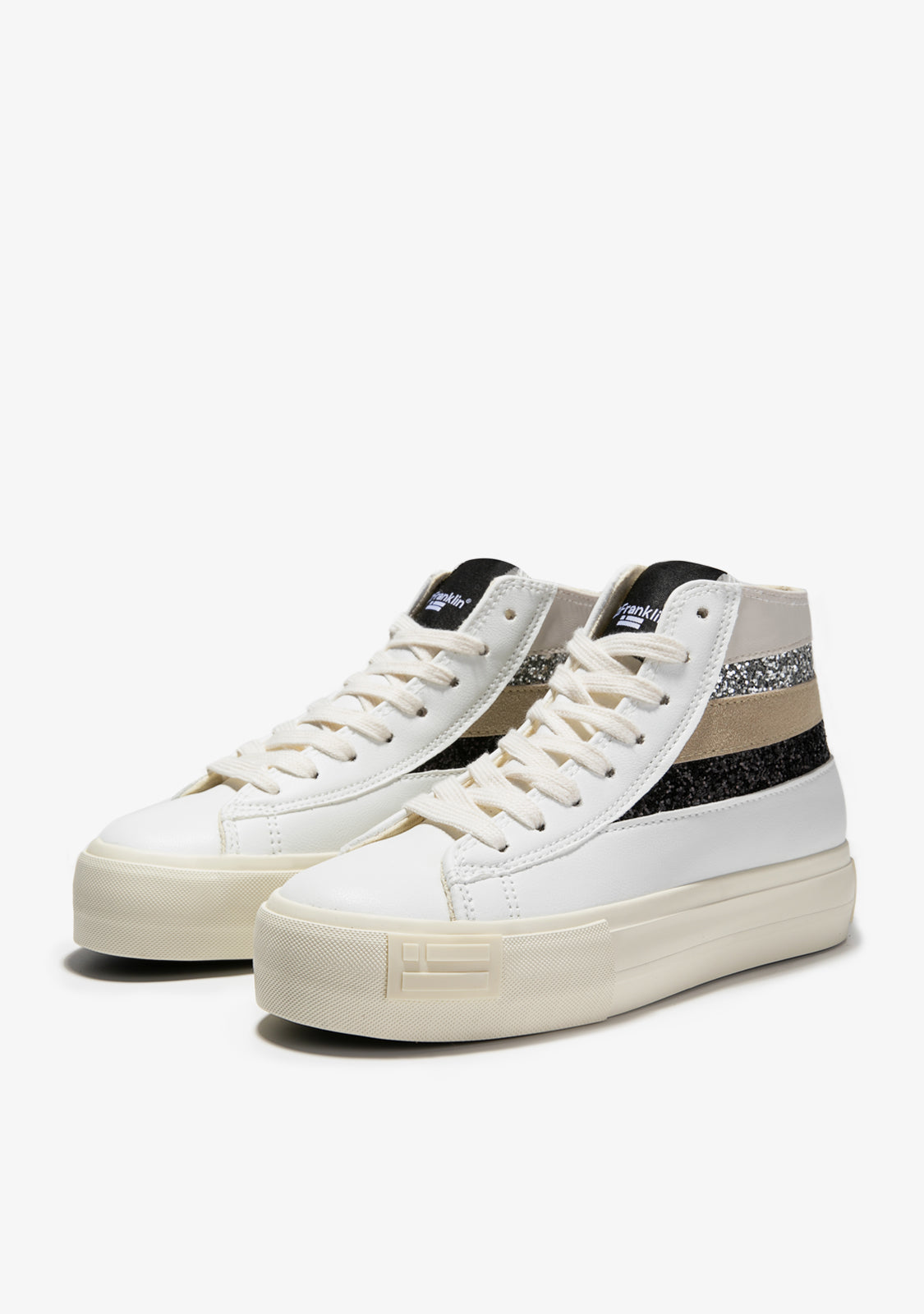 Este modelo está construido en piel sintética blanca y una combinación de franjas en su lateral de microfibra. Glitter negra y plateada, y franjas de piel sintética blanca y beige conforman este diseño abotinado. Suela de goma monocolor blanca de 4 cm con emblema D.Franklin en el lateral y lettering en el talón. Plantilla interior termoconformada de EVA inyectada.