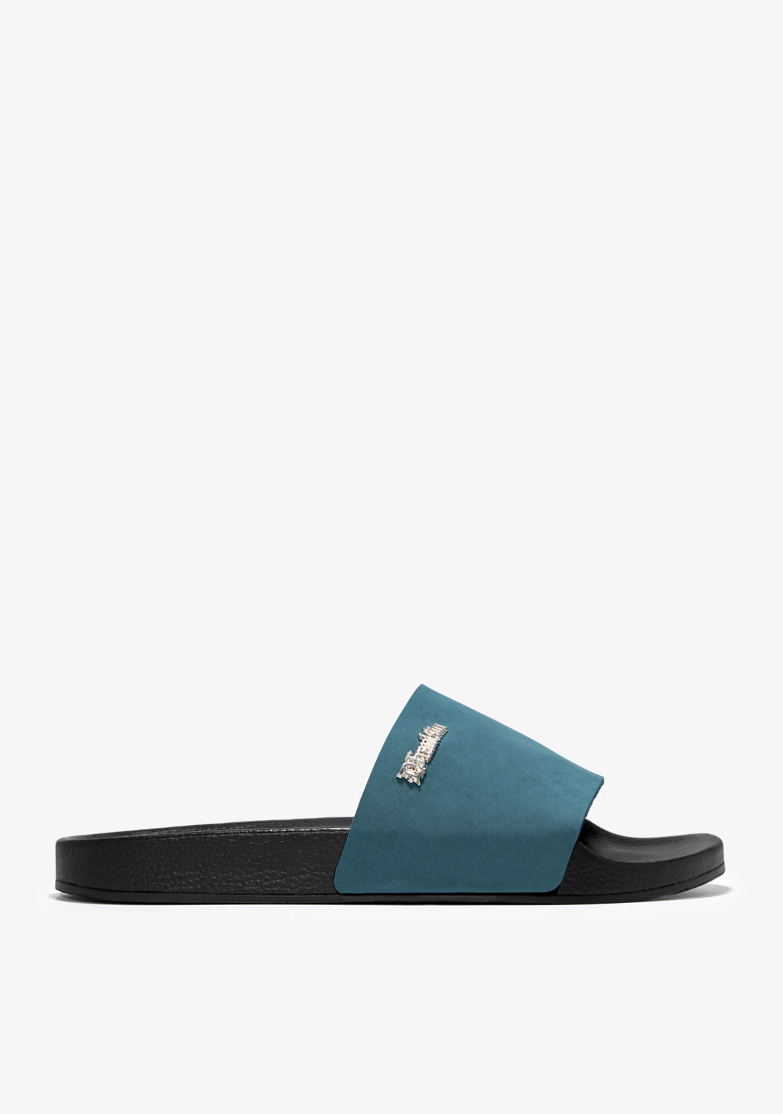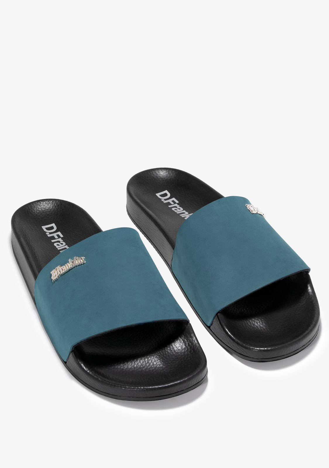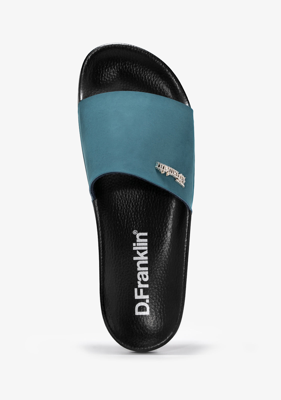 Las sandalias D.Franklin Pala Slide Patent cuentan con una tira sintética ancha de tono azul mate que garantiza la sujeción. Además, presentan nuestro emblema D.Franklin en la parte superior de la misma. El diseño de la planta presenta un moldeado que se adapta a la perfección a la forma del pie.