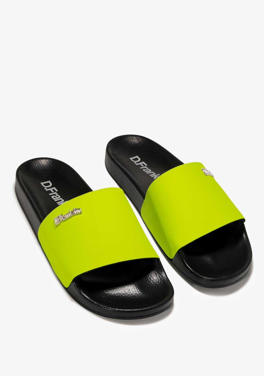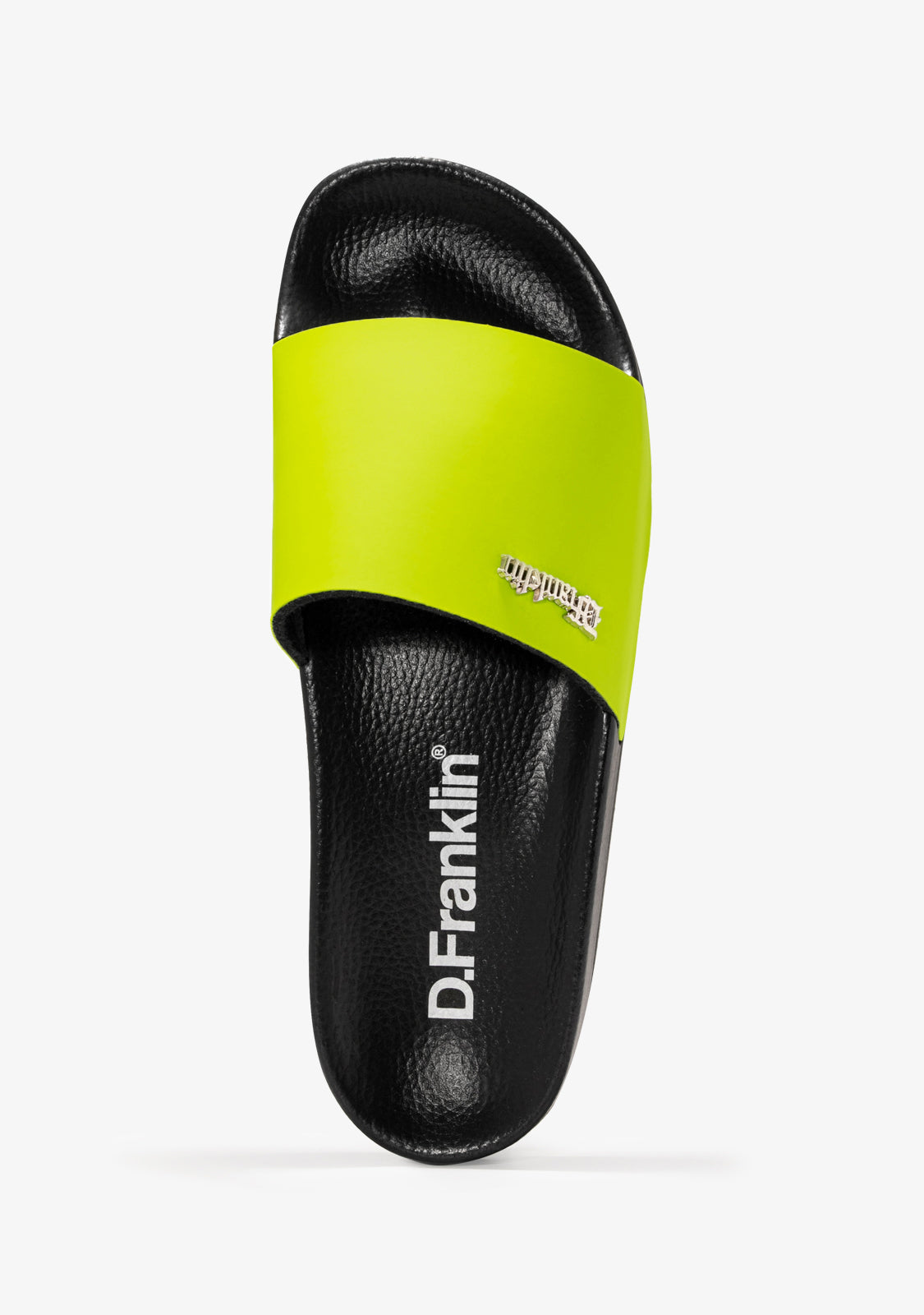 Las sandalias D.Franklin Pala Slide Patent cuentan con una tira sintética ancha de tono lima mate que garantiza la sujeción. Además, presentan nuestro emblema D.Franklin en la parte superior de la misma. El diseño de la planta presenta un moldeado que se adapta a la perfección a la forma del pie.