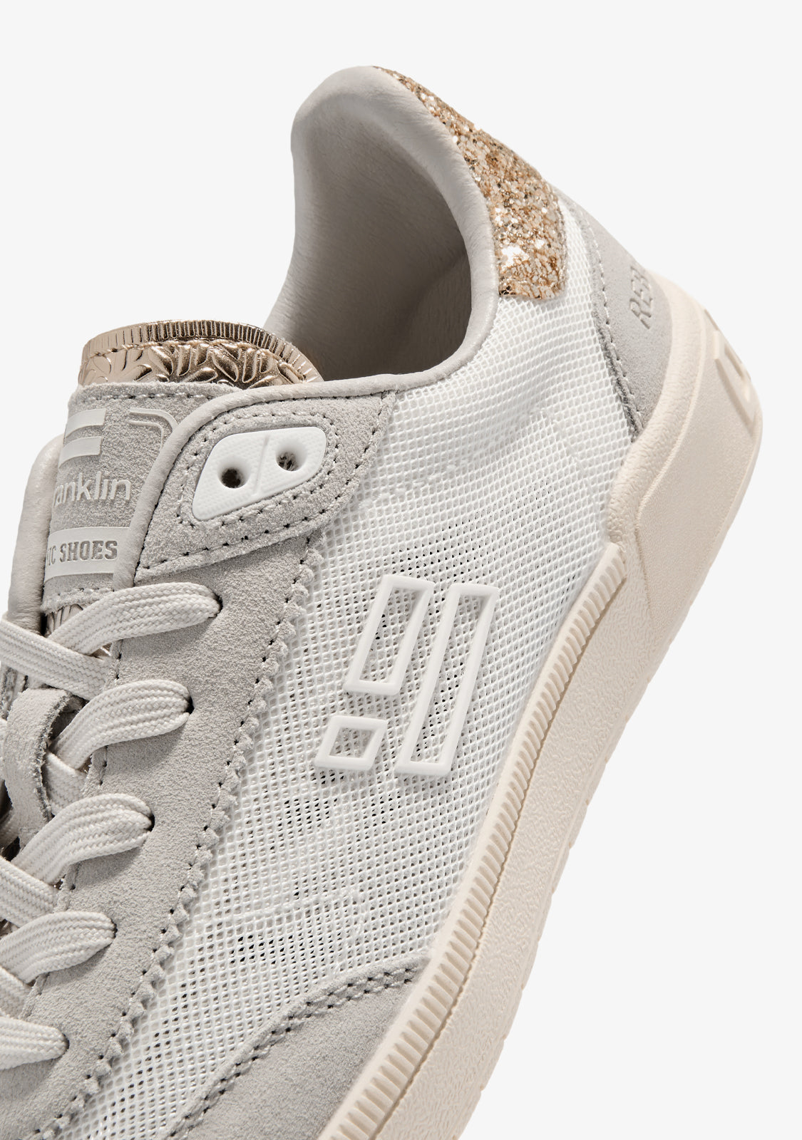 Rebel Mesh White / Gold Glitter muestra carácter desde el primer paso. Un look blanco, combinado con detalles en purpurina dorada, para elevar cualquier look. La mezcla de malla transpirable y acentos brillantes crea un acabado atrevido y de alto contraste.