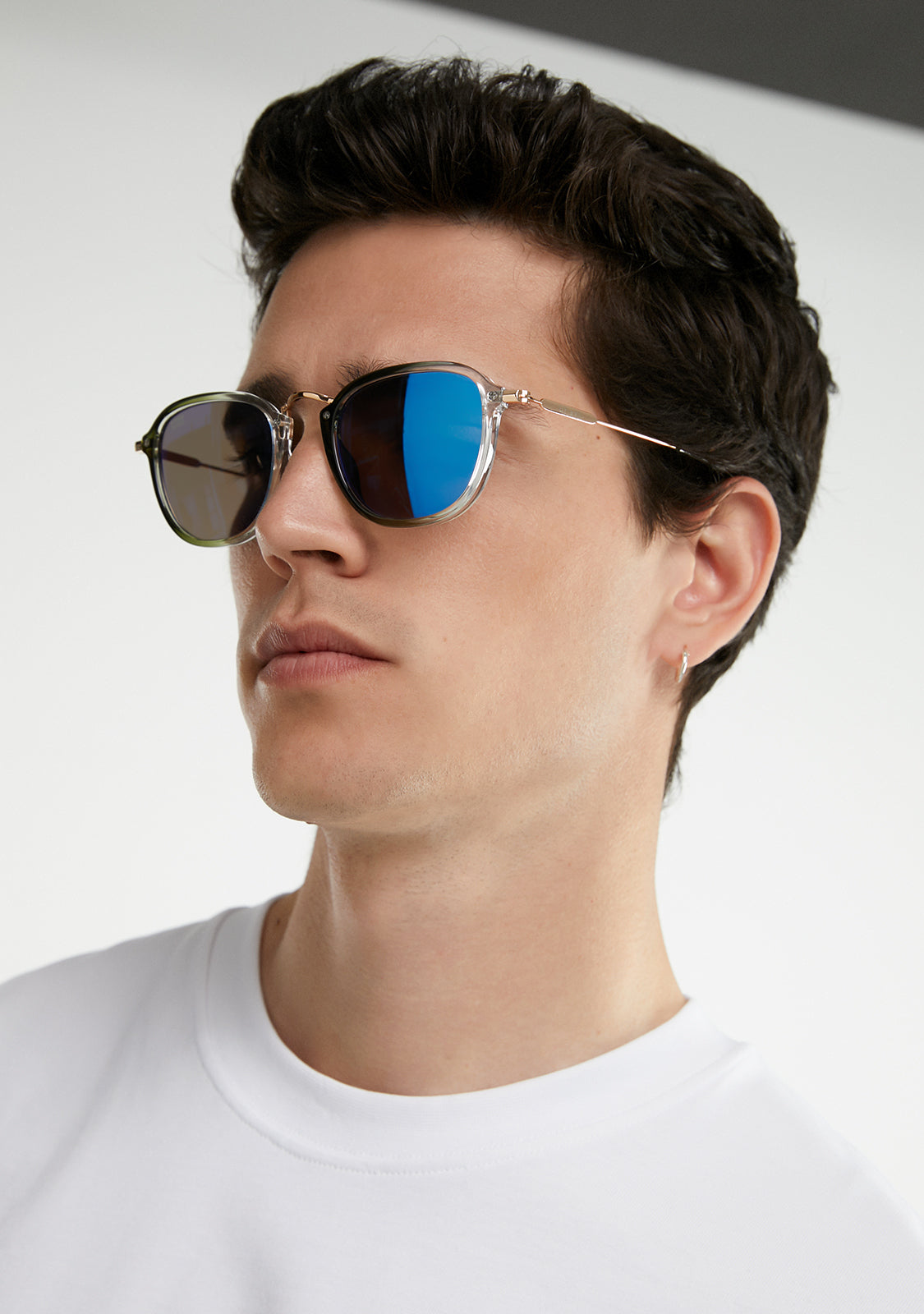 Sus lentes con espejado revo de policarbonato presentan un tono verde ahumado sobre una silueta dorada de estructura cuadrada. Cuenta con los detalles distintivos de nuestra marca: el logo grabado en ambas varillas metálicas y nuestro emblema en la lente derecha. Con un ancho de lente de 51 mm y una montura frontal de 147 mm, estas gafas realzan las facciones de cualquier rostro. Las varillas laterales son de acero inoxidable y tienen una longitud de 145 mm.