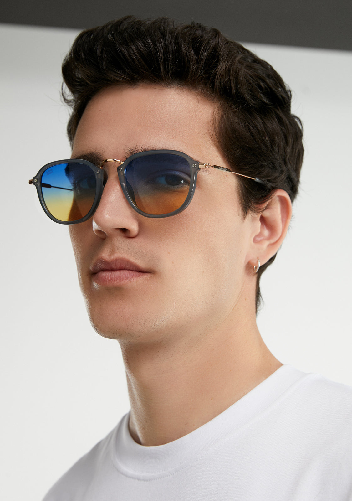 Sus lentes de policarbonato presentan un tono azul ahumado sobre una silueta dorada de estructura cuadrada. Cuenta con los detalles distintivos de nuestra marca: el logo grabado en ambas varillas metálicas y nuestro emblema en la lente derecha. Con un ancho de lente de 51 mm y una montura frontal de 147 mm, estas gafas realzan las facciones de cualquier rostro. Las varillas laterales son de acero inoxidable y tienen una longitud de 145 mm.