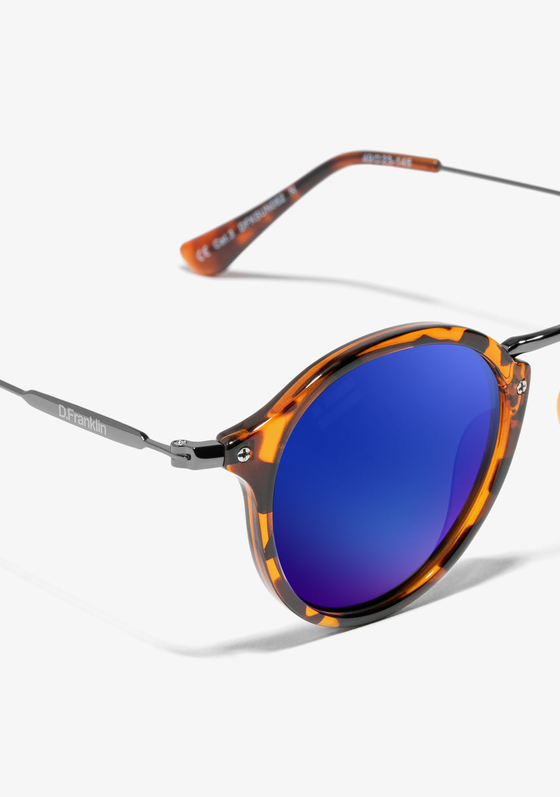 Sus lentes redondeadas ahumadas en tonos azules con efecto espejo y su montura en carey refuerzan la estética setentera de este modelo. Cuenta con nuestros detalles distintivos D.Franklin: el logo grabado en ambas varillas metálicas y nuestro emblema en la lente derecha. Con un ancho de lente de 49 mm y una montura con ancho frontal de 148 mm, estas gafas favorecen a la mayoría de los rostros. Las varillas laterales tienen una longitud de 145 mm.