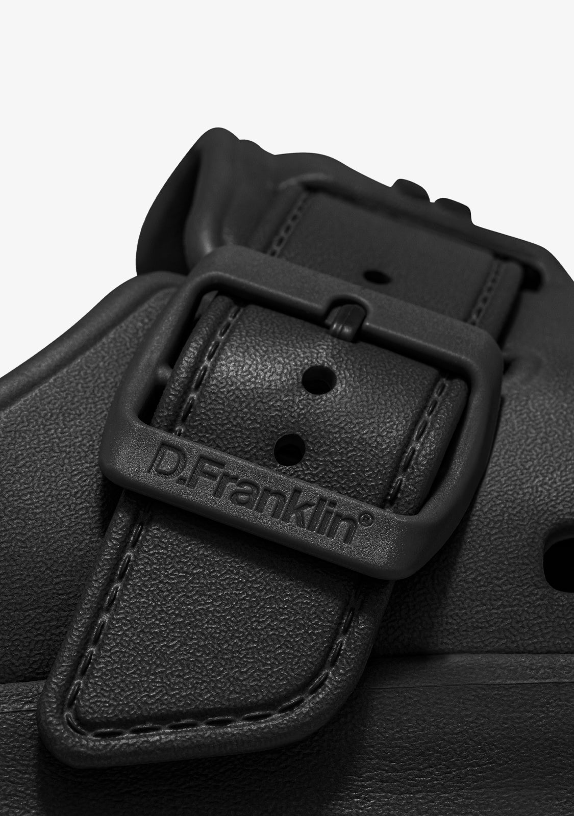Zueco D.Franklin con doble altura. Subimos el nivel de un icono del verano. Para redefinir la estética swimwear.