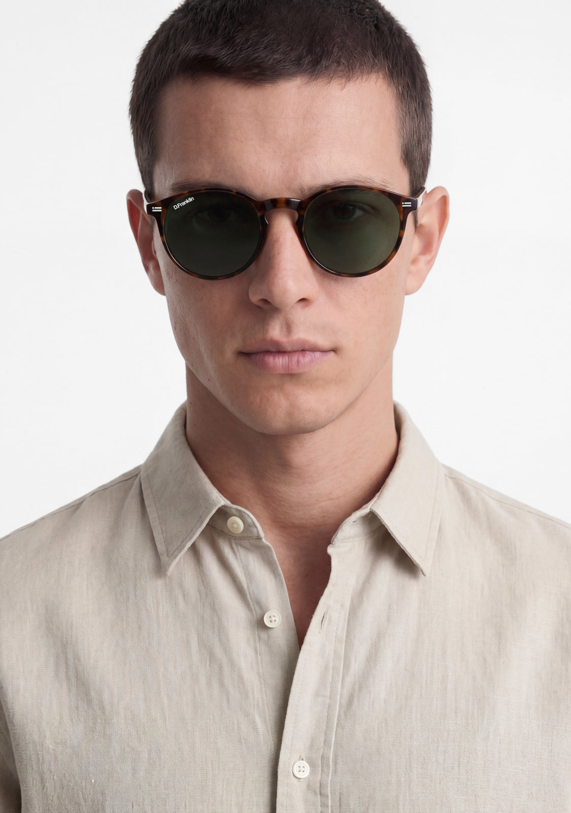 Sus lentes polarizadas negras y su marco carey crean un acabado impoluto. Este diseño cuenta con logo D.Franklin metalizado en ambas patillas de acetato y nuestro emblema en la lente derecha. Con una montura frontal de 137 mm y un ancho de lente de 50 mm, estas gafas favorecen a la mayoría de rostros. Las varillas laterales tienen una longitud de 145 mm.