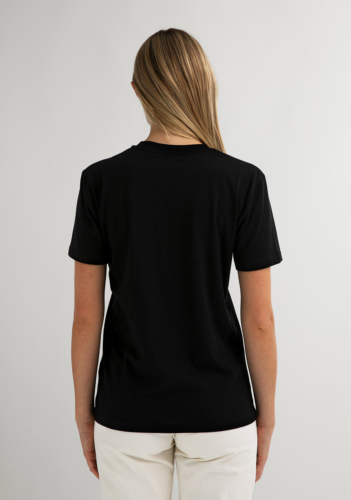 Camiseta de manga corta negra con contorno de logo D.Franklin en blanco. Parte delantera con inspiración en las universidades y fraternidades de Estados Unidos. Cuello redondo con puntada doble. Confeccionada con algodón 100% orgánico. Modelo femenino.